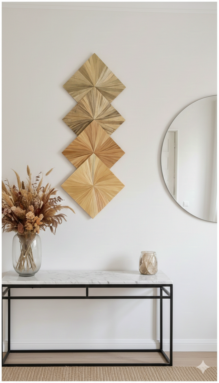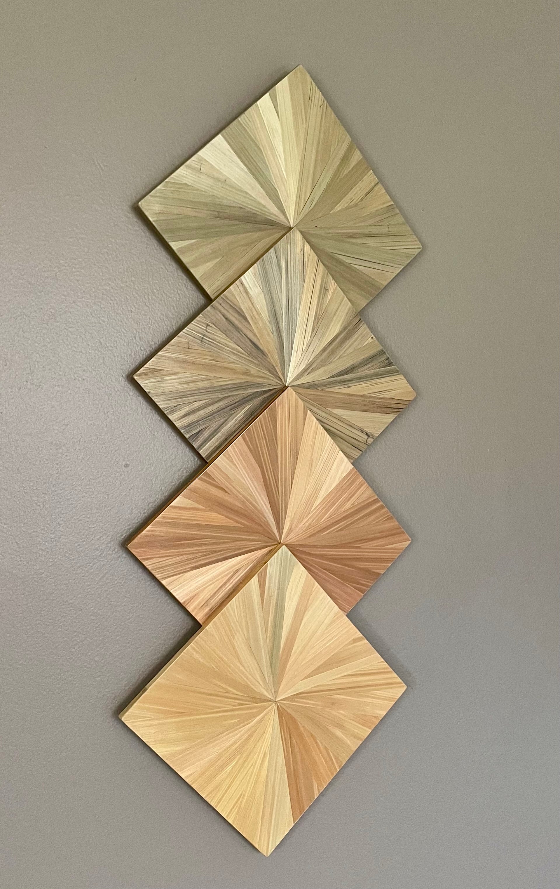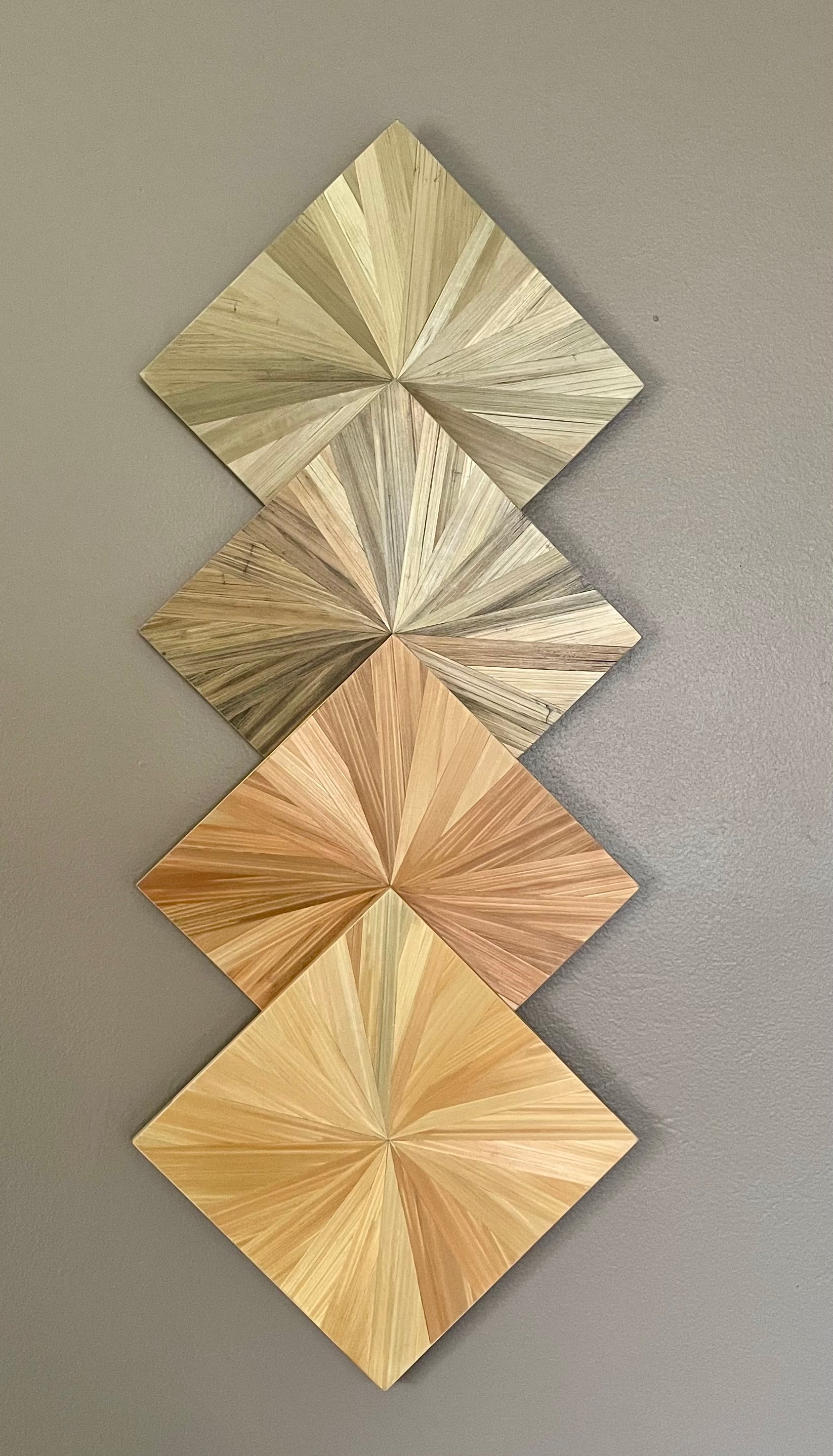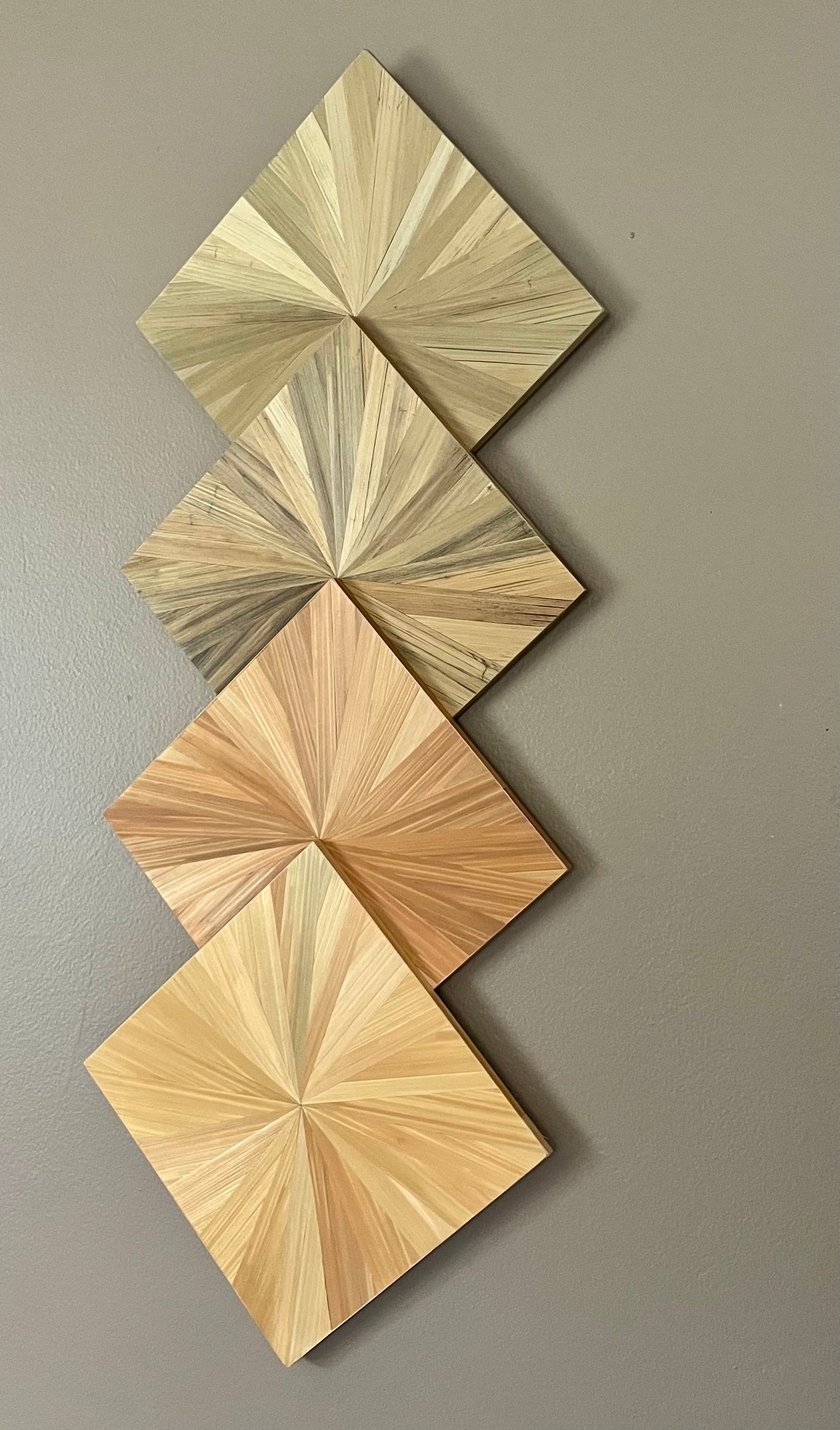 Découvrez "Cascade Blonde", une création murale unique réalisée entièrement à la main selon les techniques traditionnelles de la marqueterie de paille. Cette œuvre sculpturale se compose de quatre losanges imbriqués, créant un mouvement vertical élégant et dynamique.