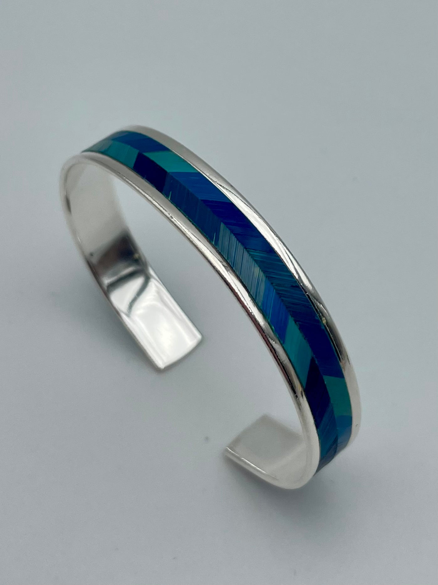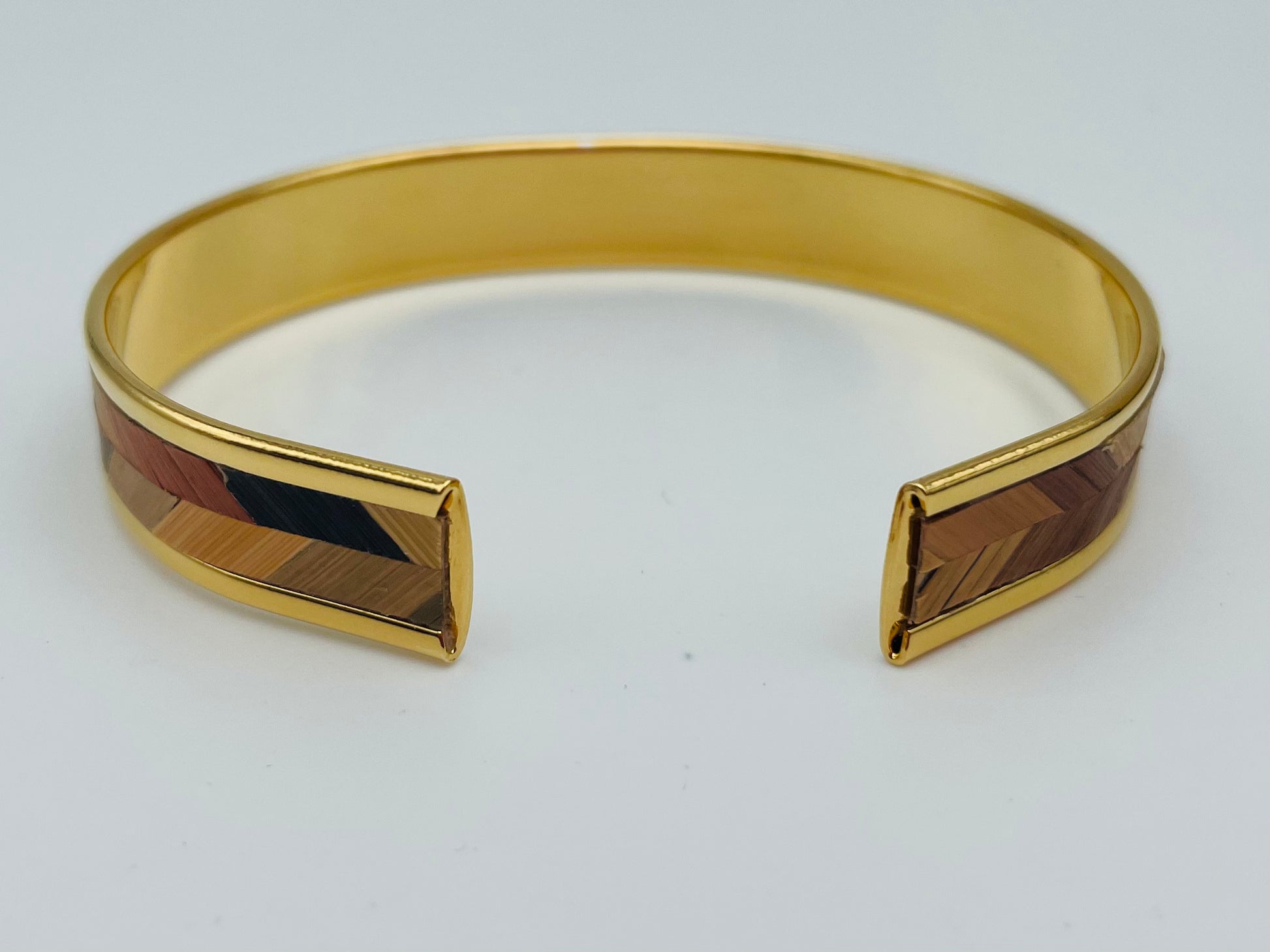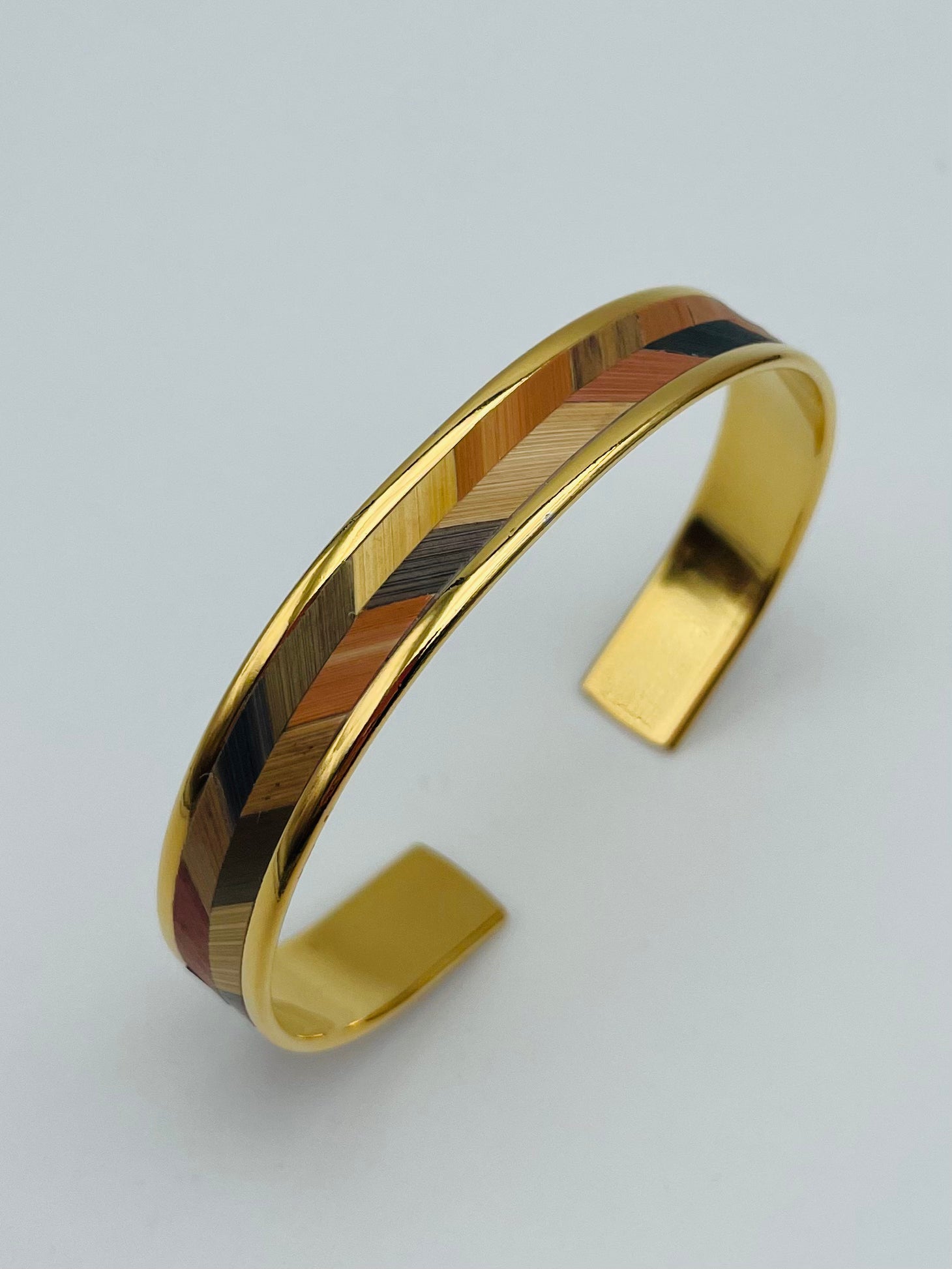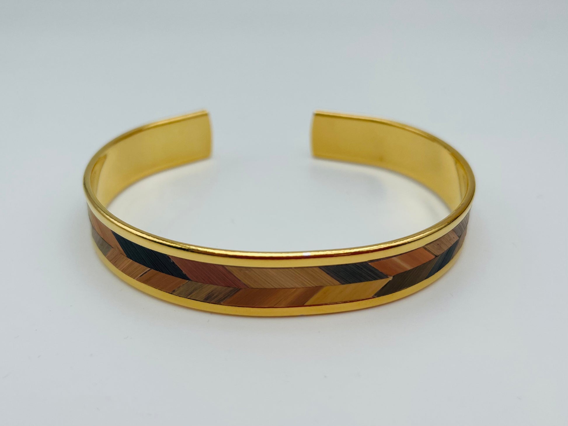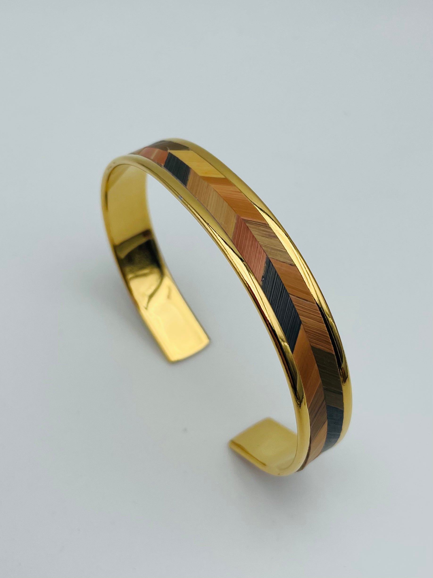 Une manchette fine ajustable, raffinée et élégante, façonnée en laiton avec de l'or fin 24k ou placage argent et rehaussée d'un motif en marqueterie de paille, en forme de chevron.