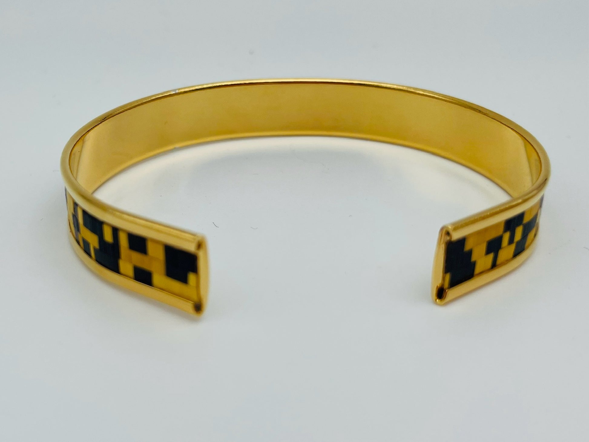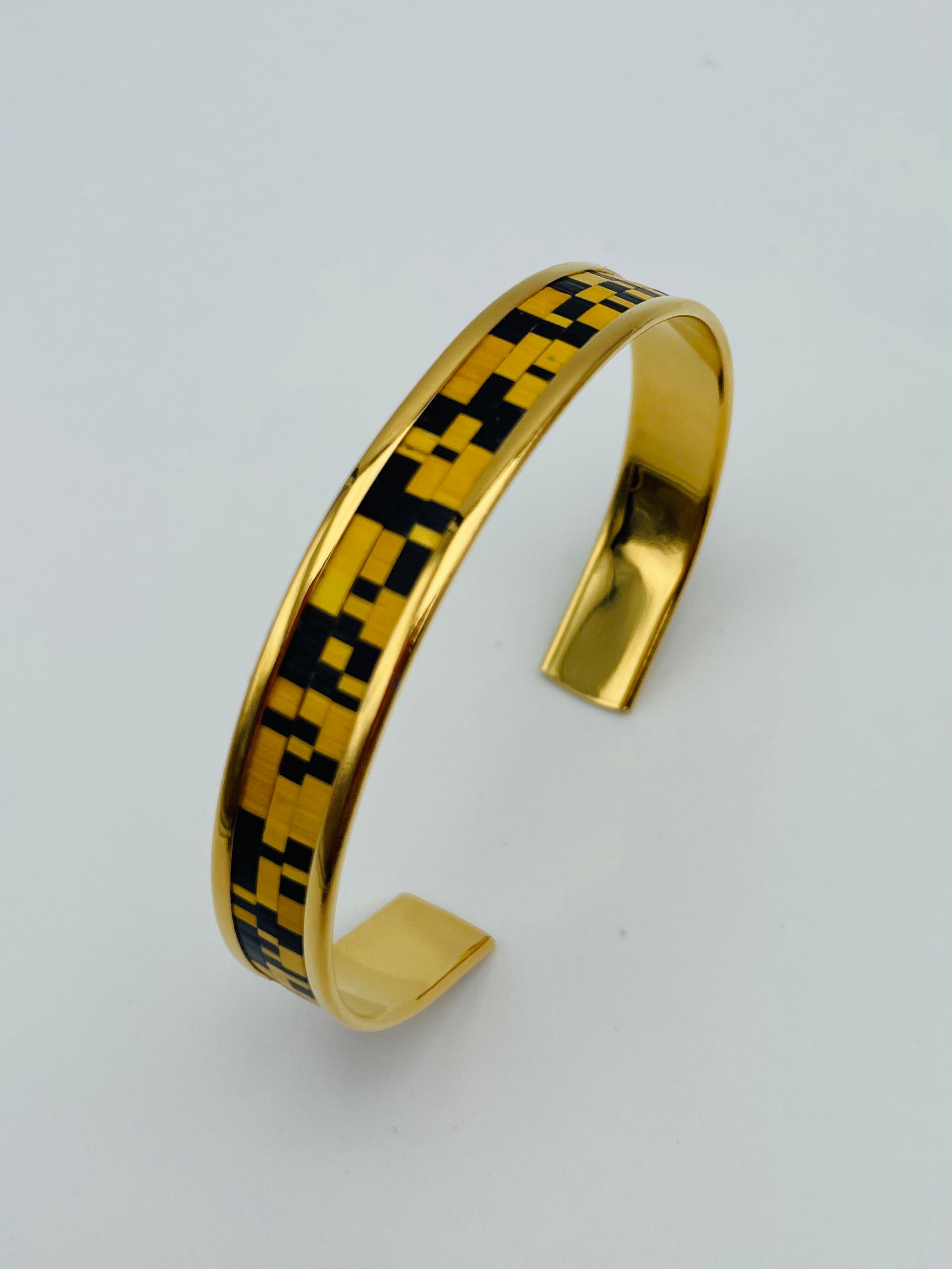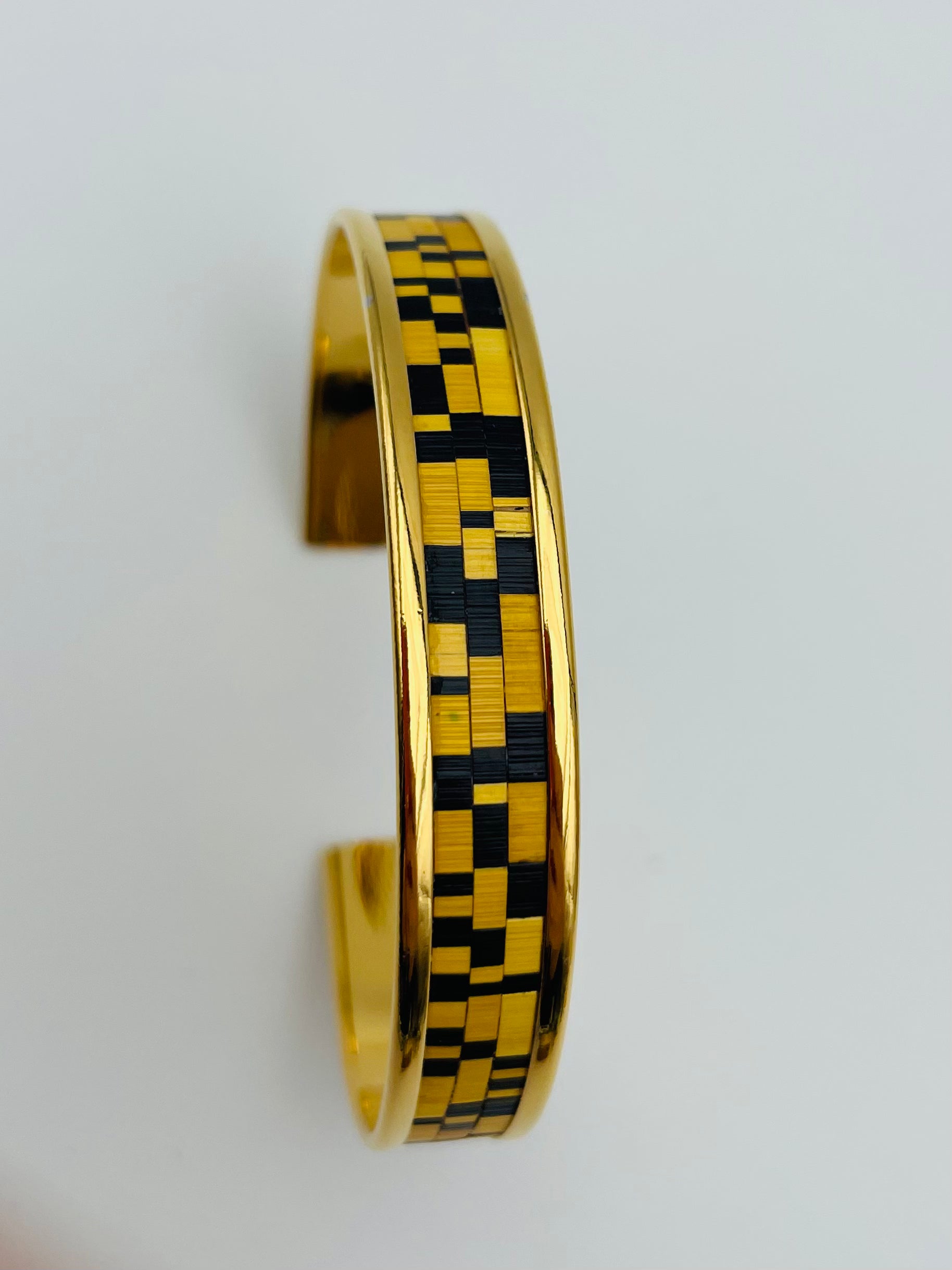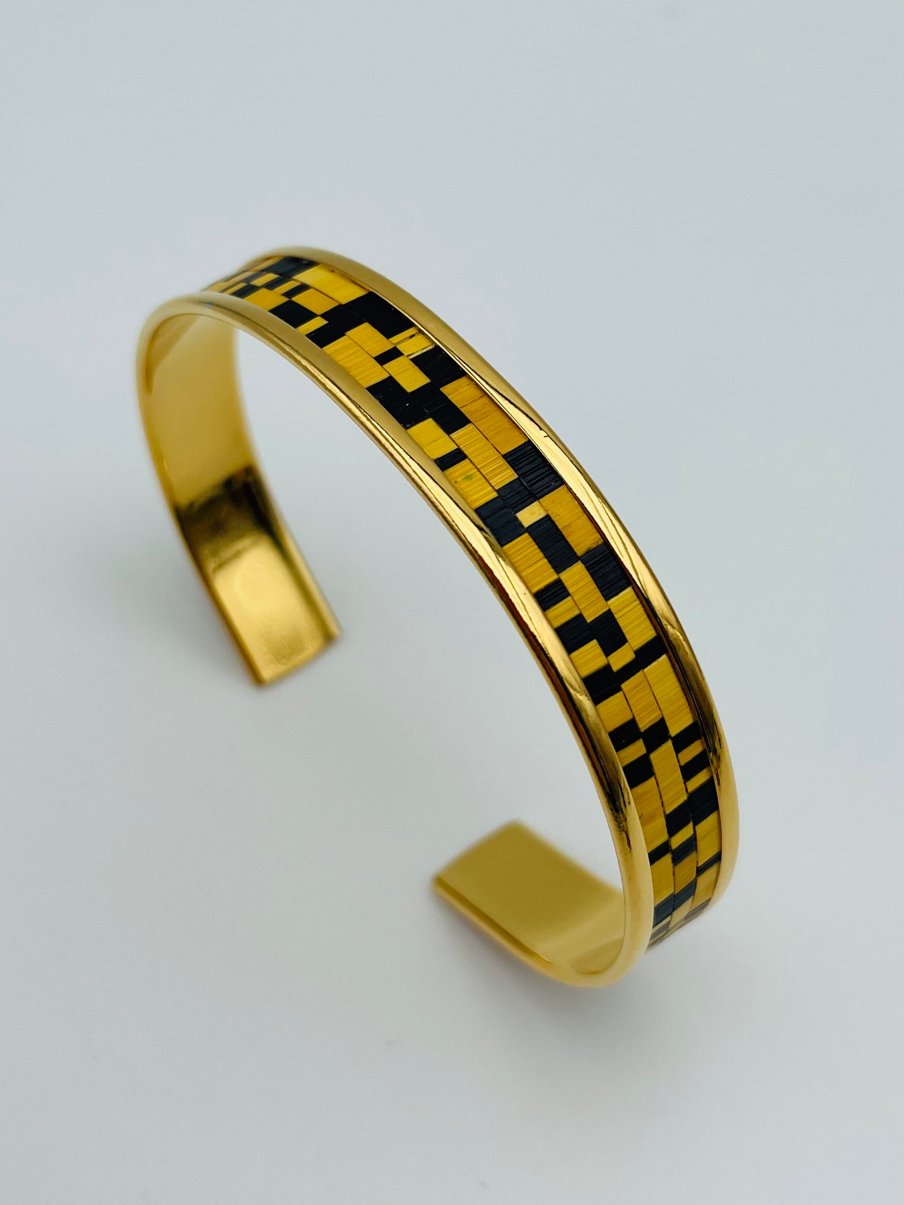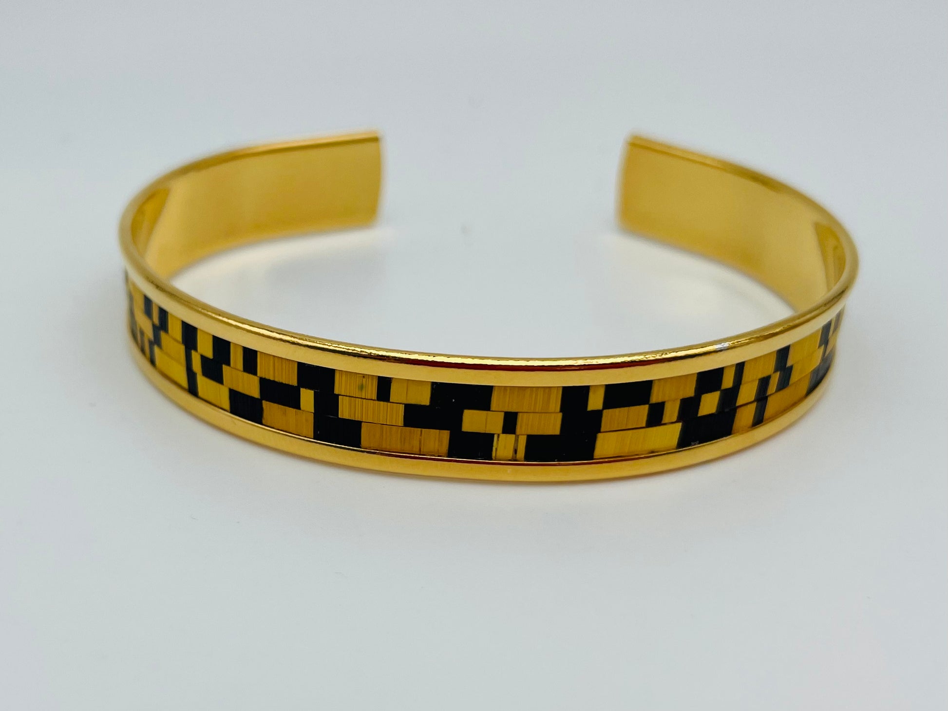 Manchette fine en laiton doré à l’or fin 24k recouvert de marqueterie de paille
