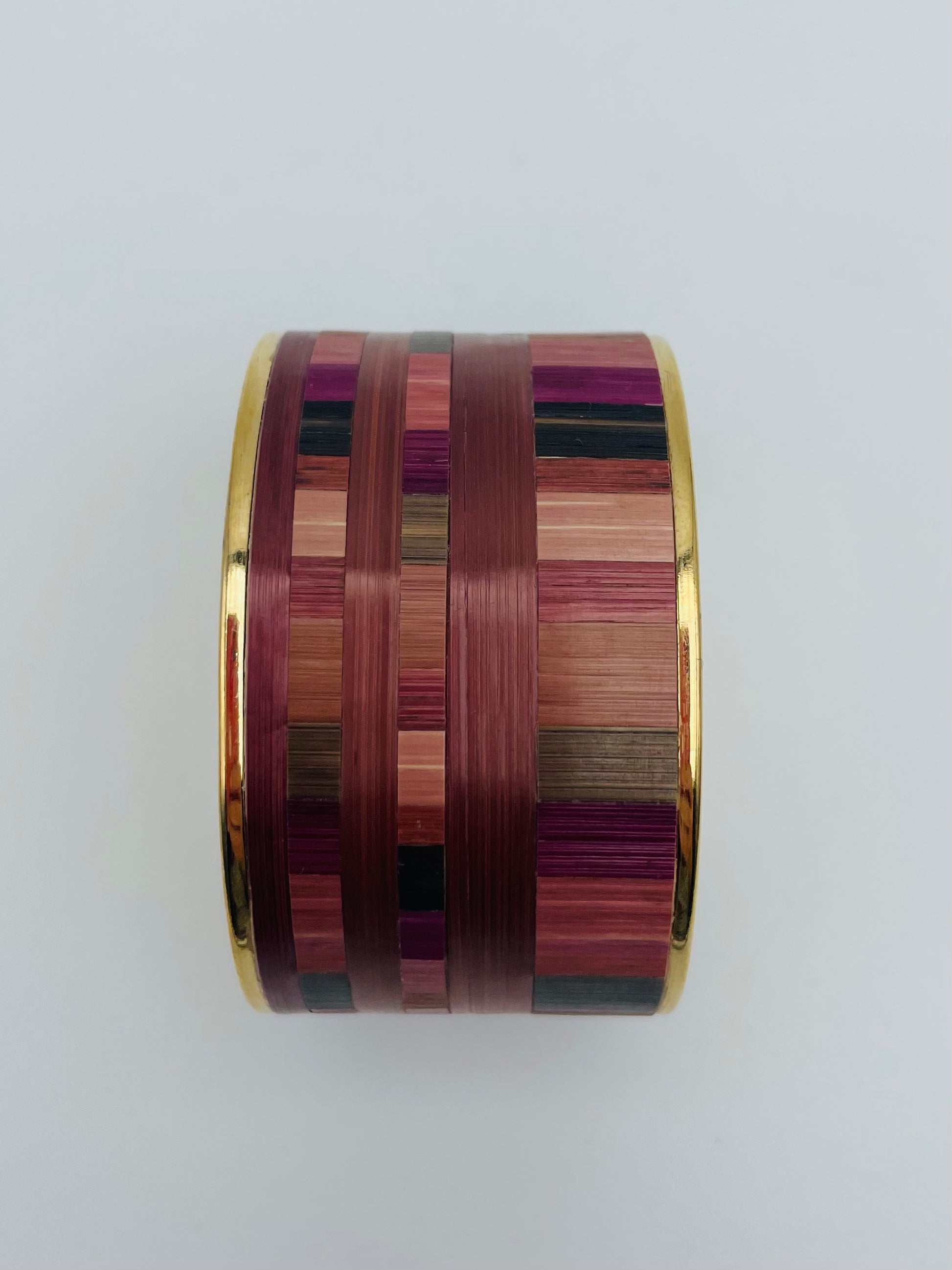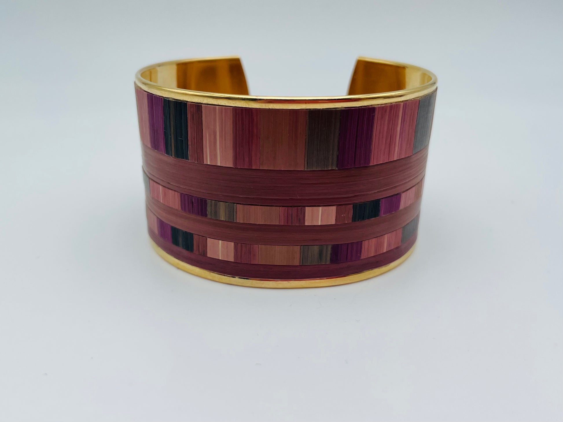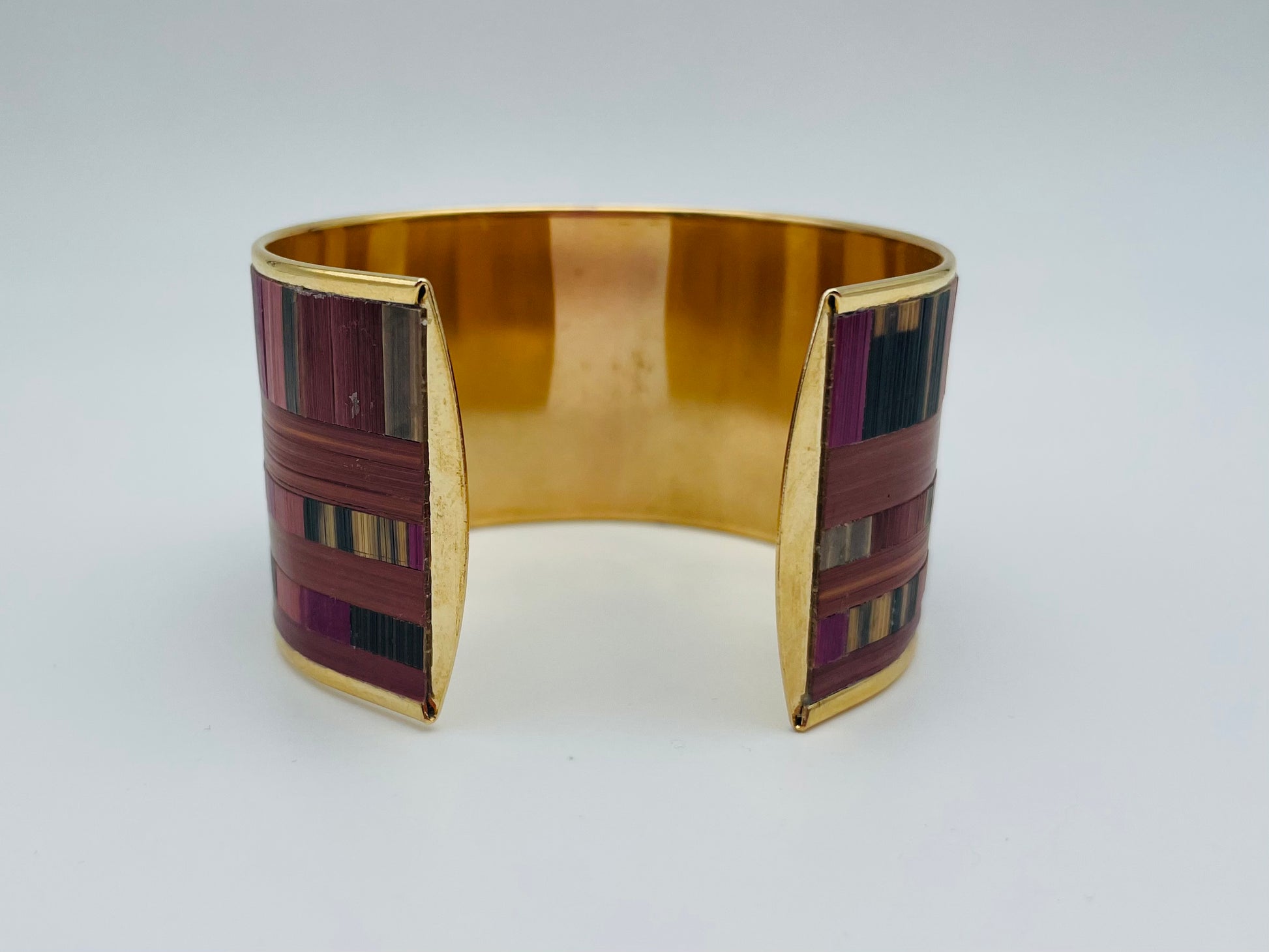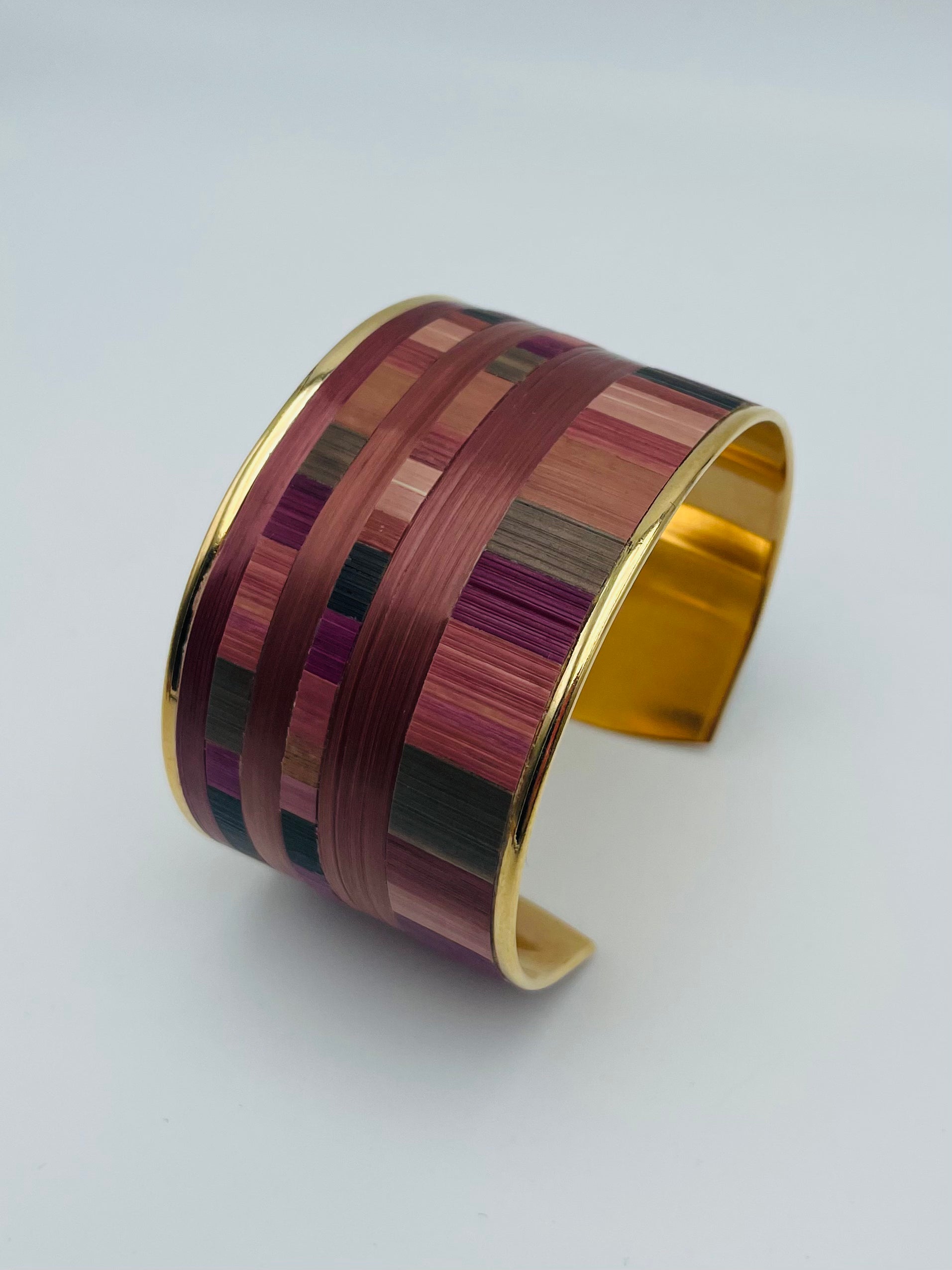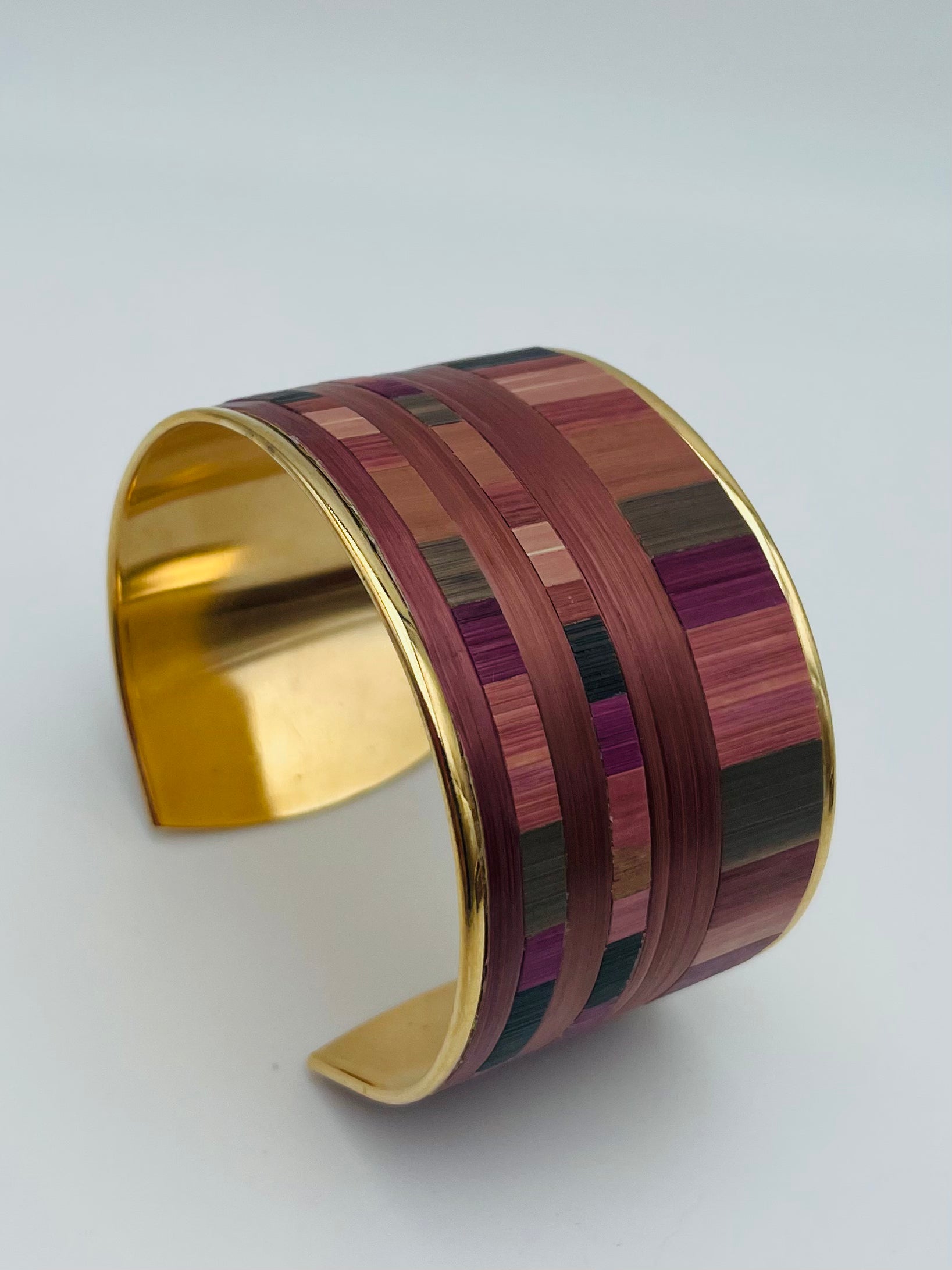 Manchette large ajustable en laiton doré à l’or fin 24k et recouverte de marqueterie de paille