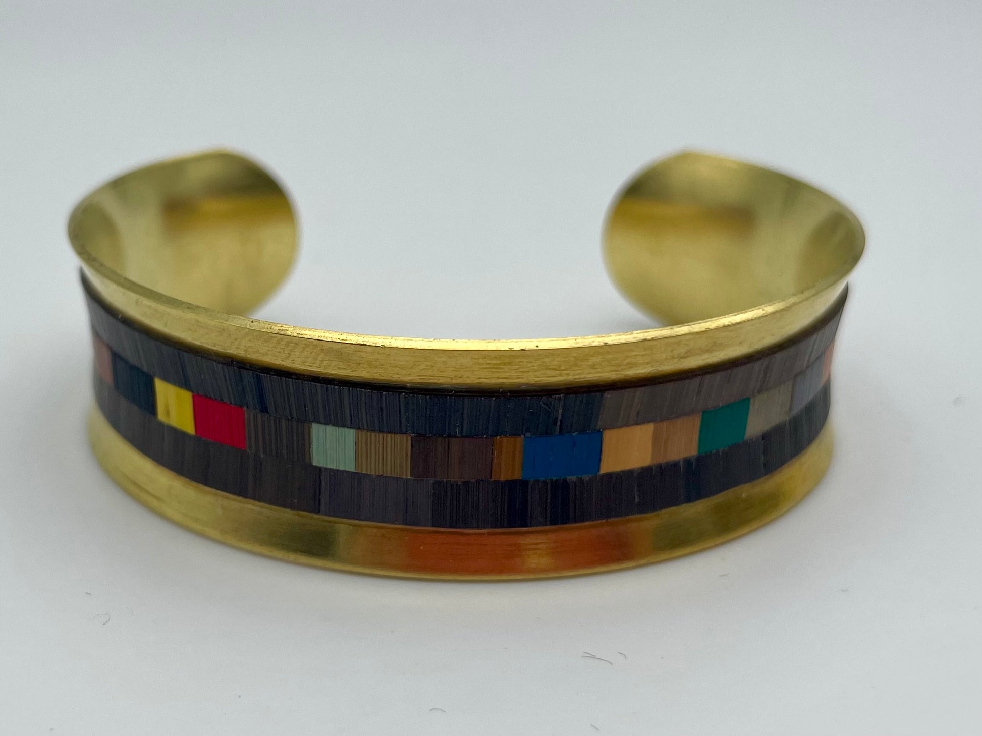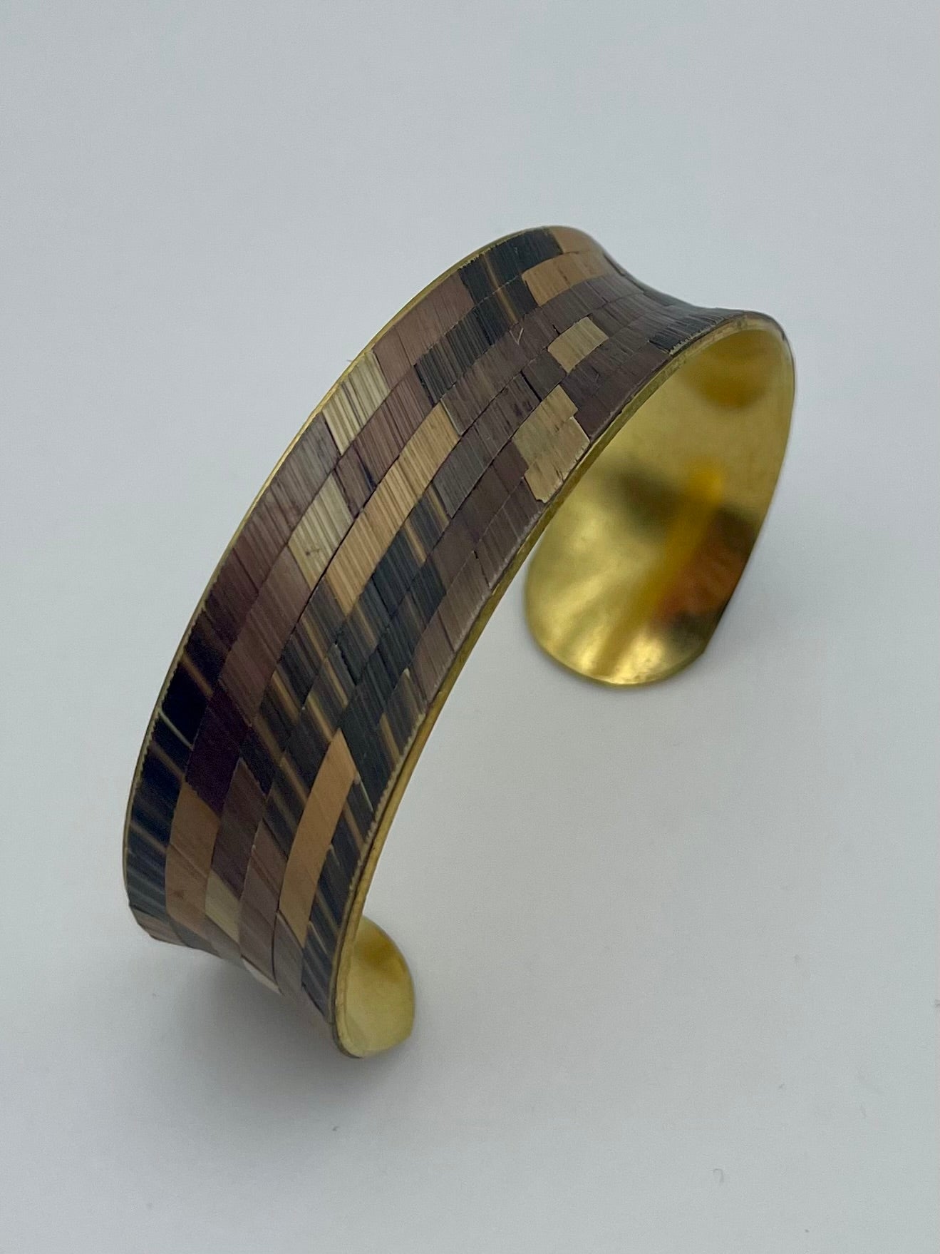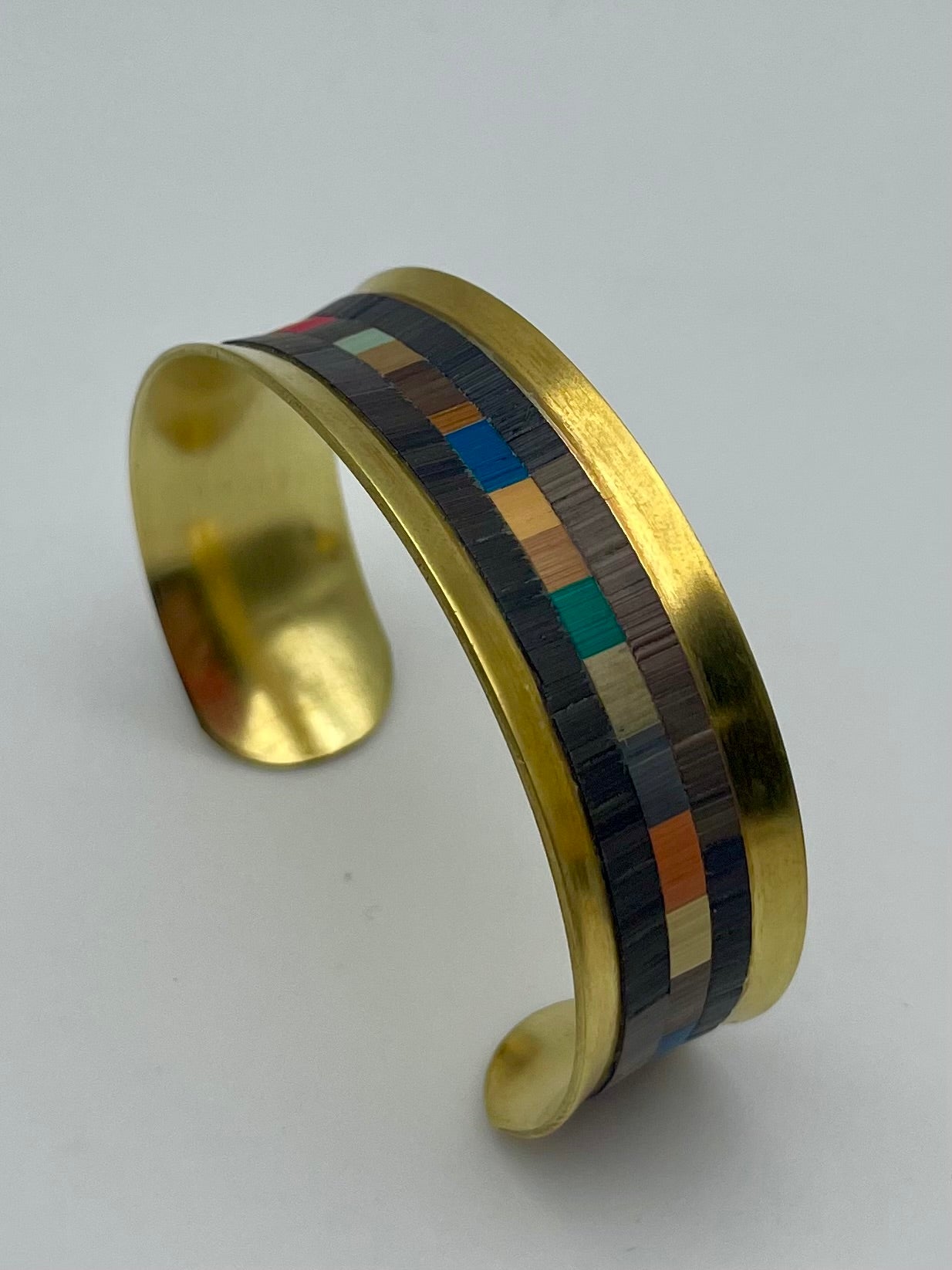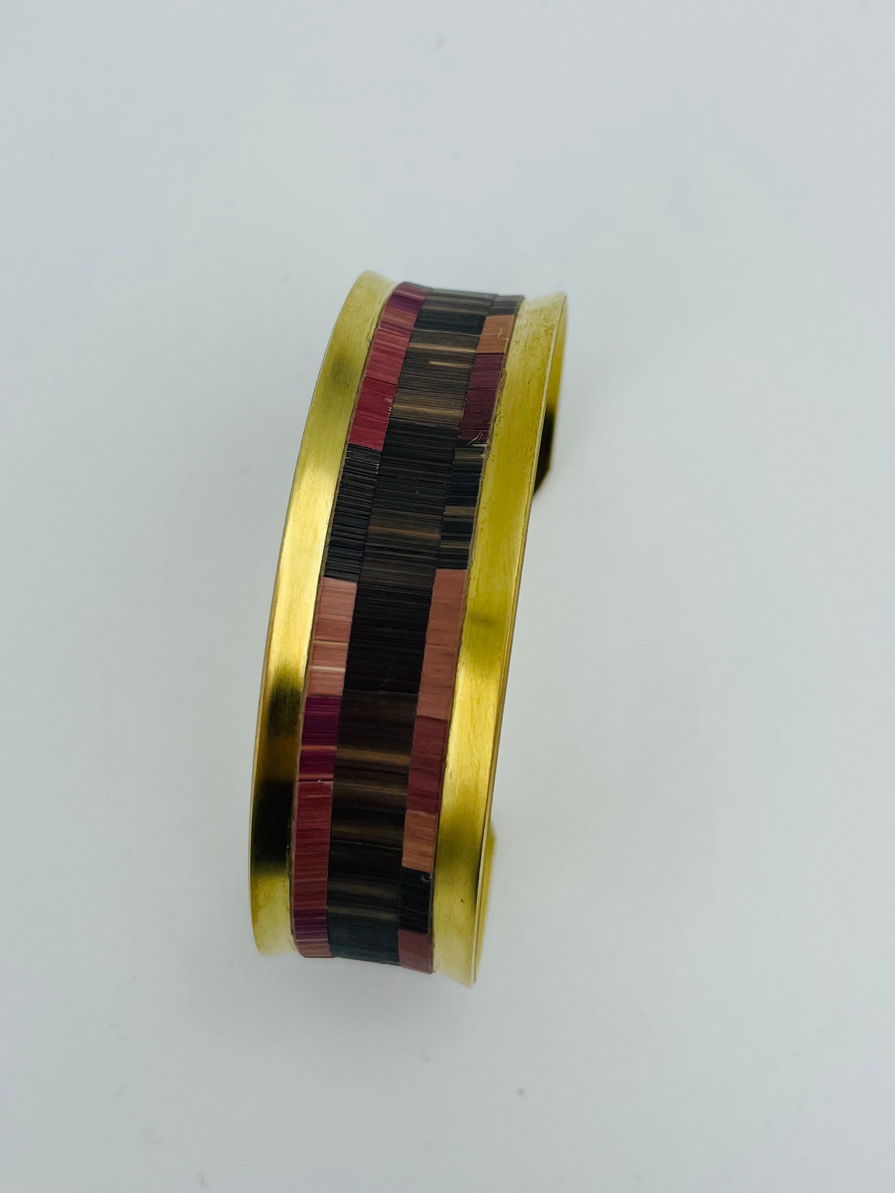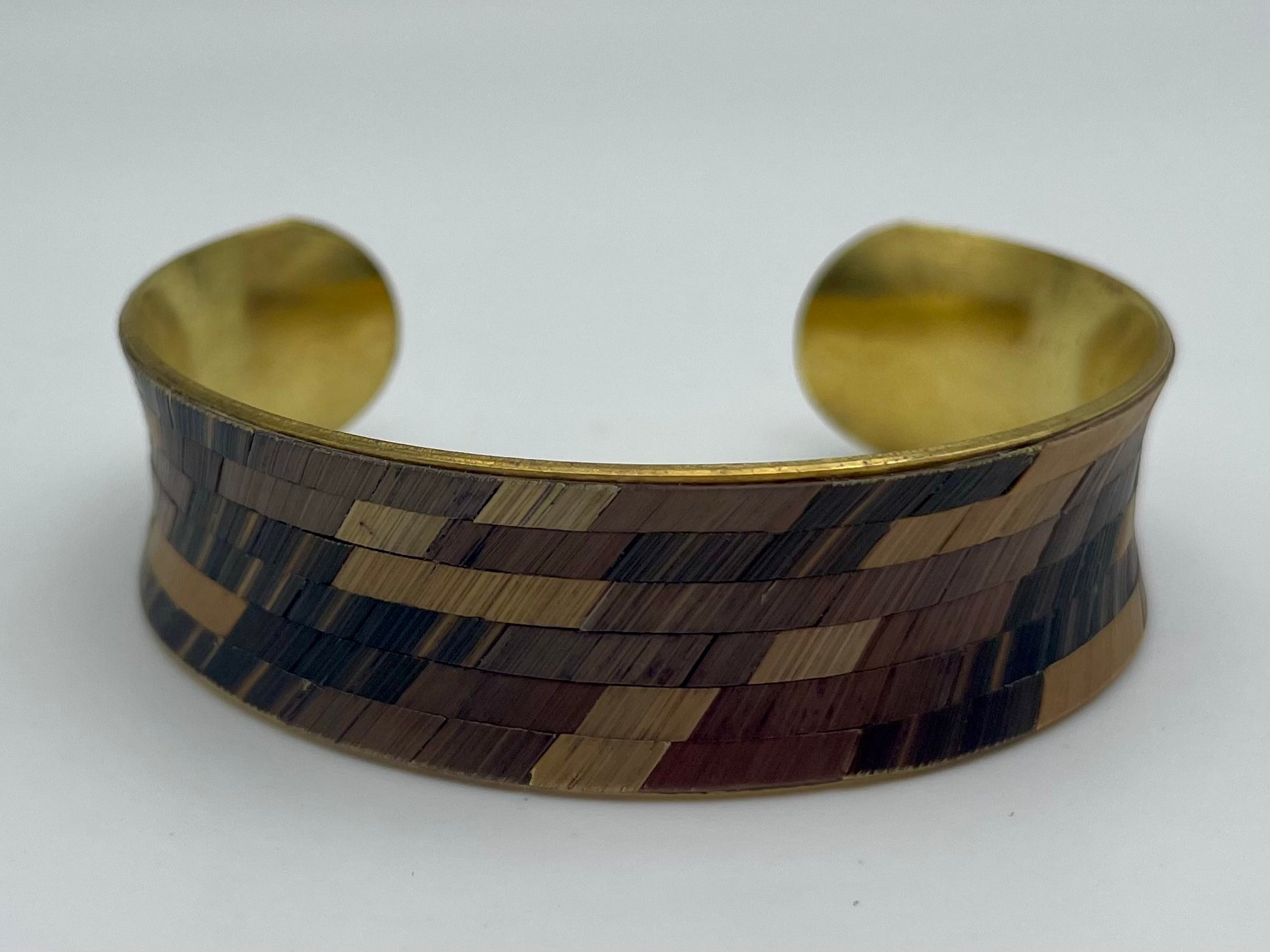 Élégante et intemporelle, cette manchette en laiton brut est sublimée par un délicat travail de marqueterie de paille. Chaque pièce est unique, alliant savoir-faire artisanal et modernité.