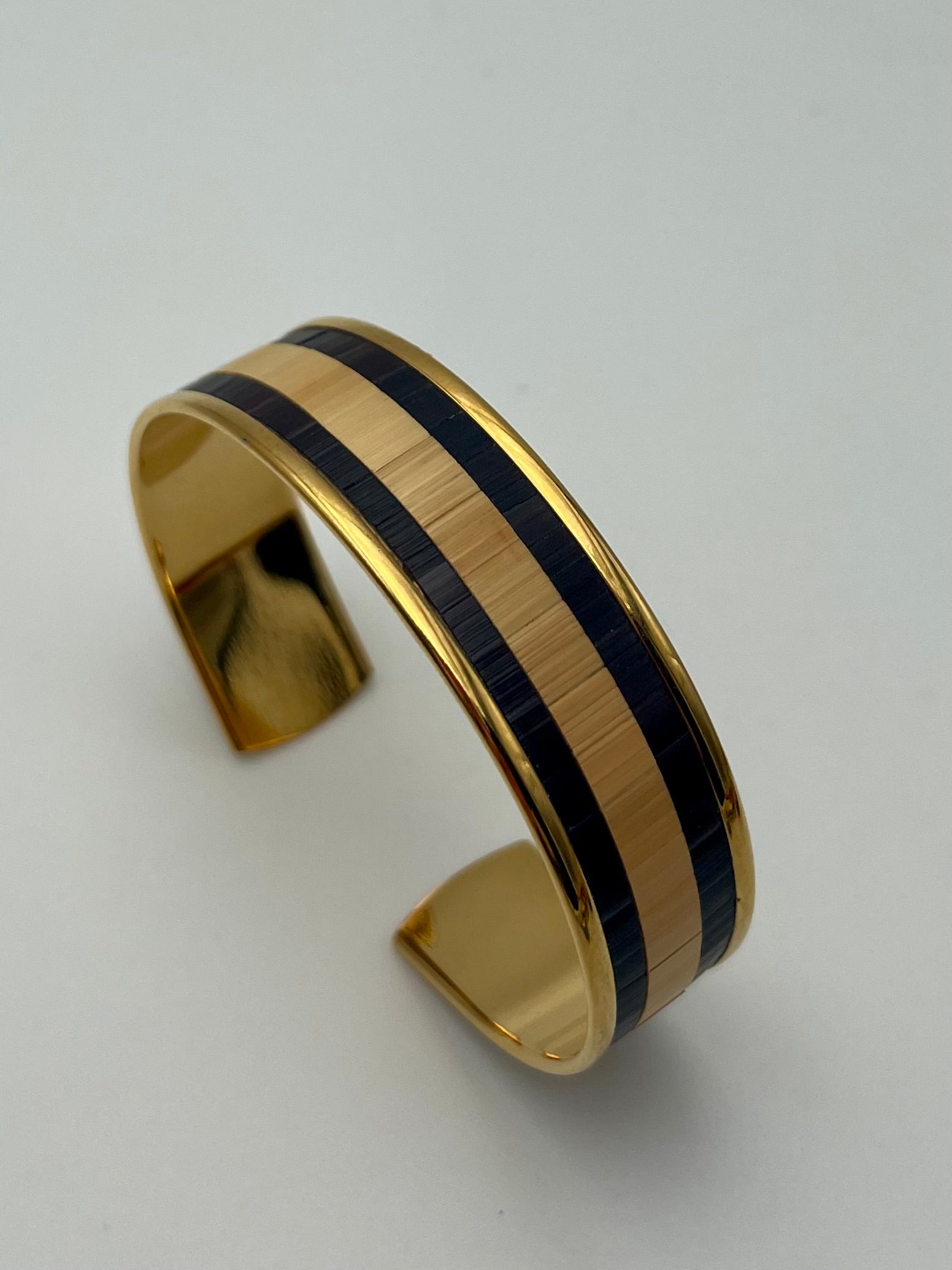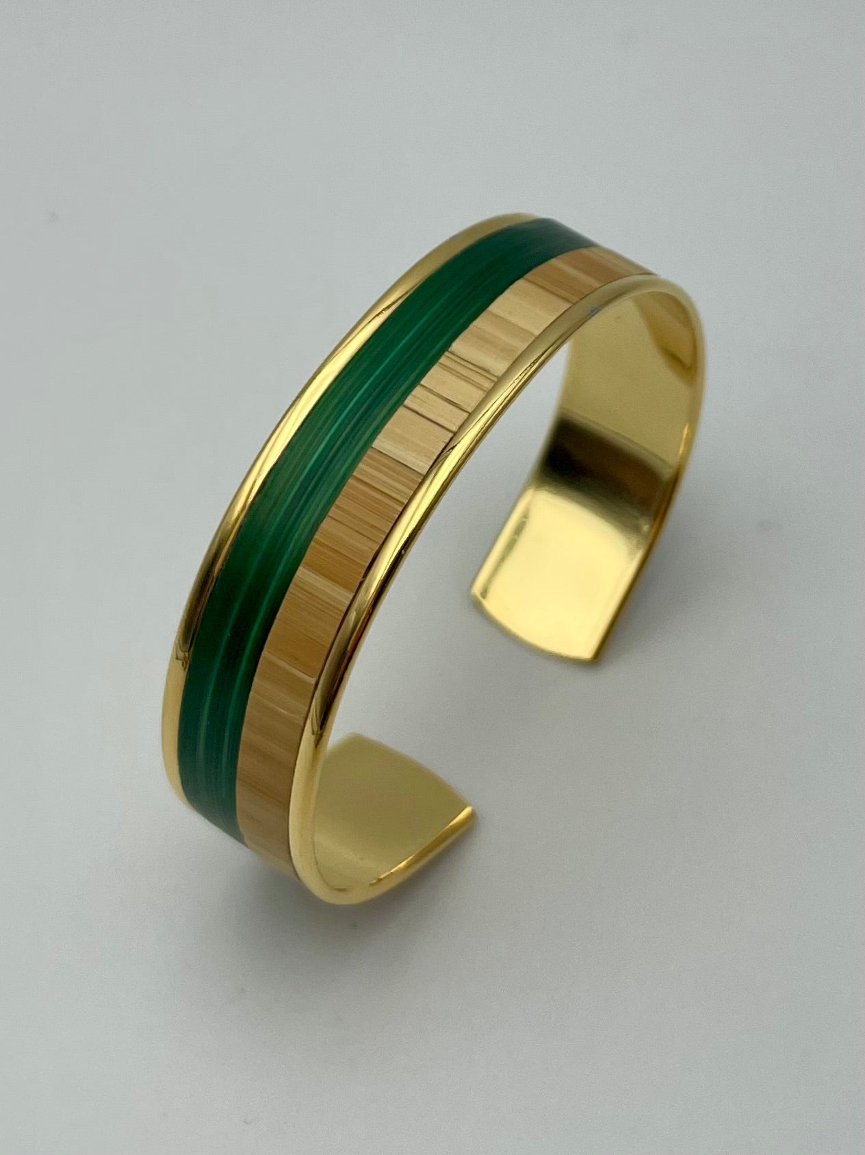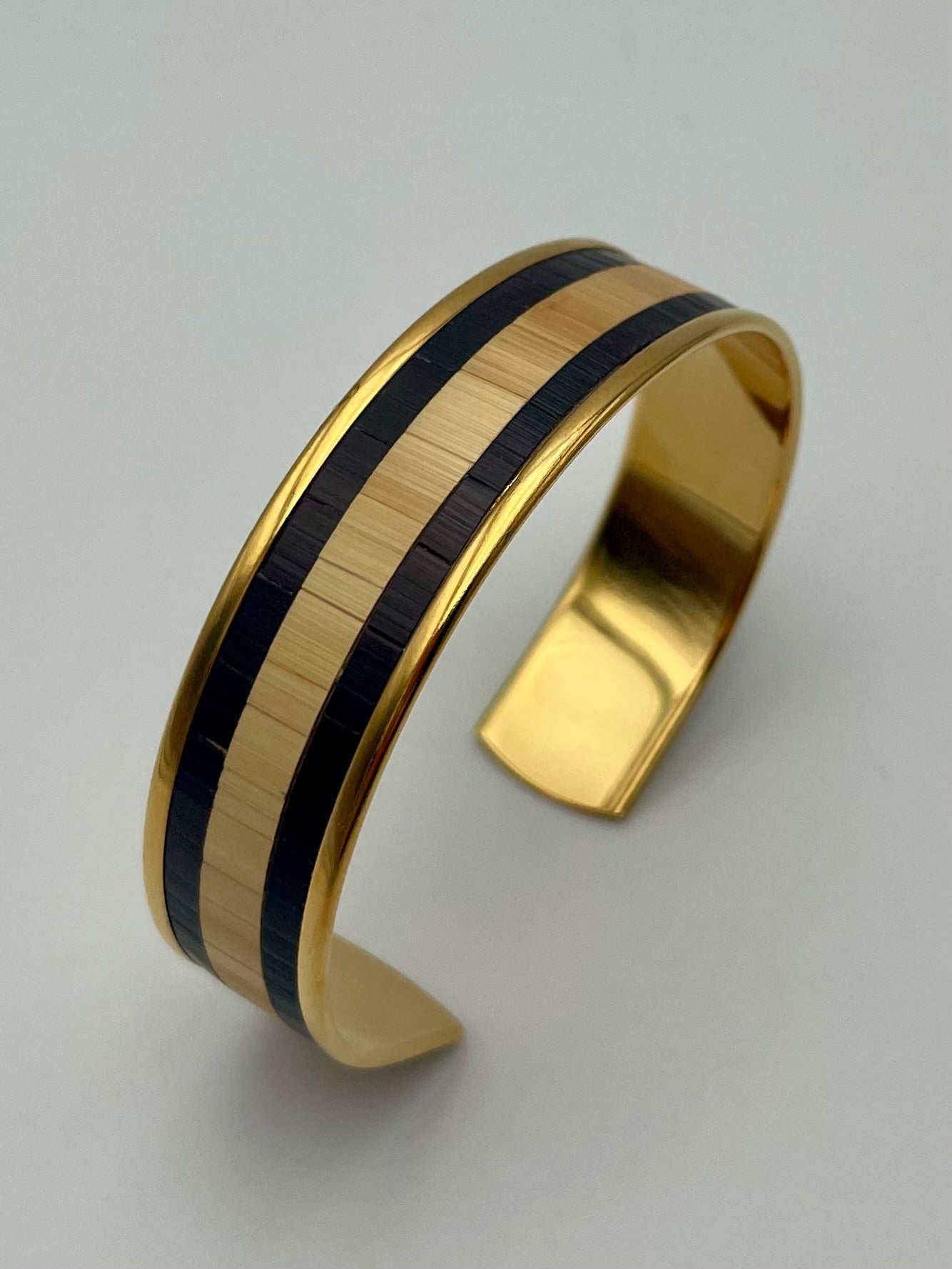 Chaque manchette ou jonc est recouvert à la main de véritables brins de paille de seigle, polis, découpés et posés un à un pour créer un éclat subtil, presque velouté. Ici, point d’excès : la paille révèle sa brillance satinée avec une élégance silencieuse, affirmée mais jamais ostentatoire.