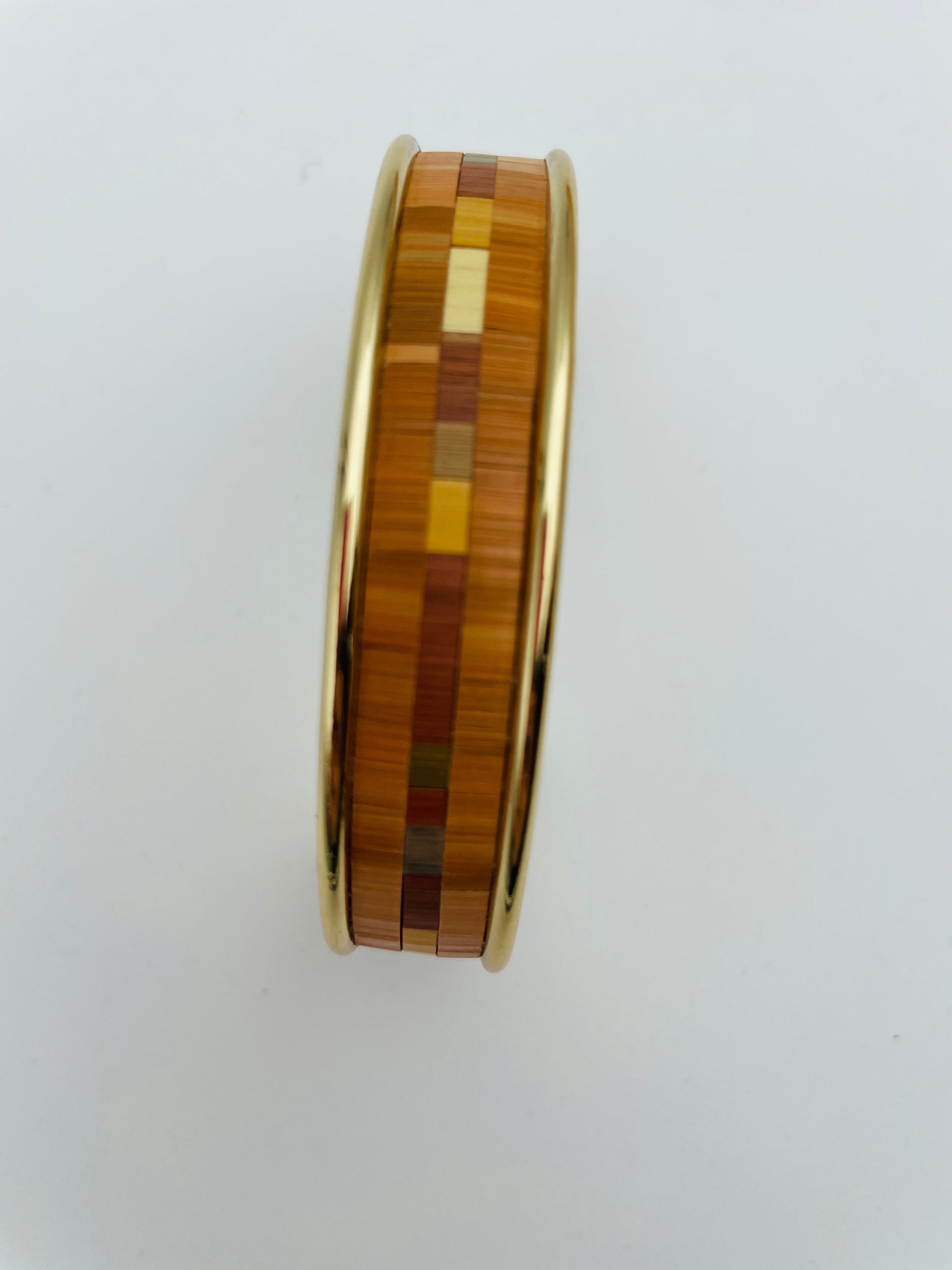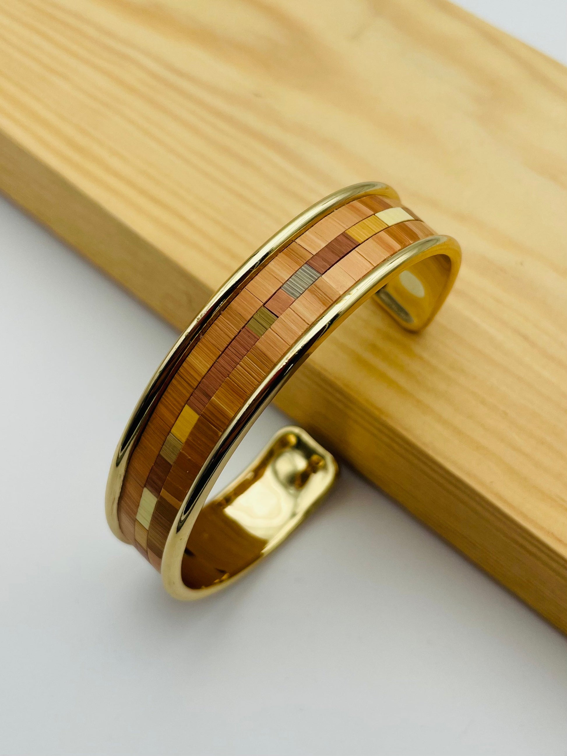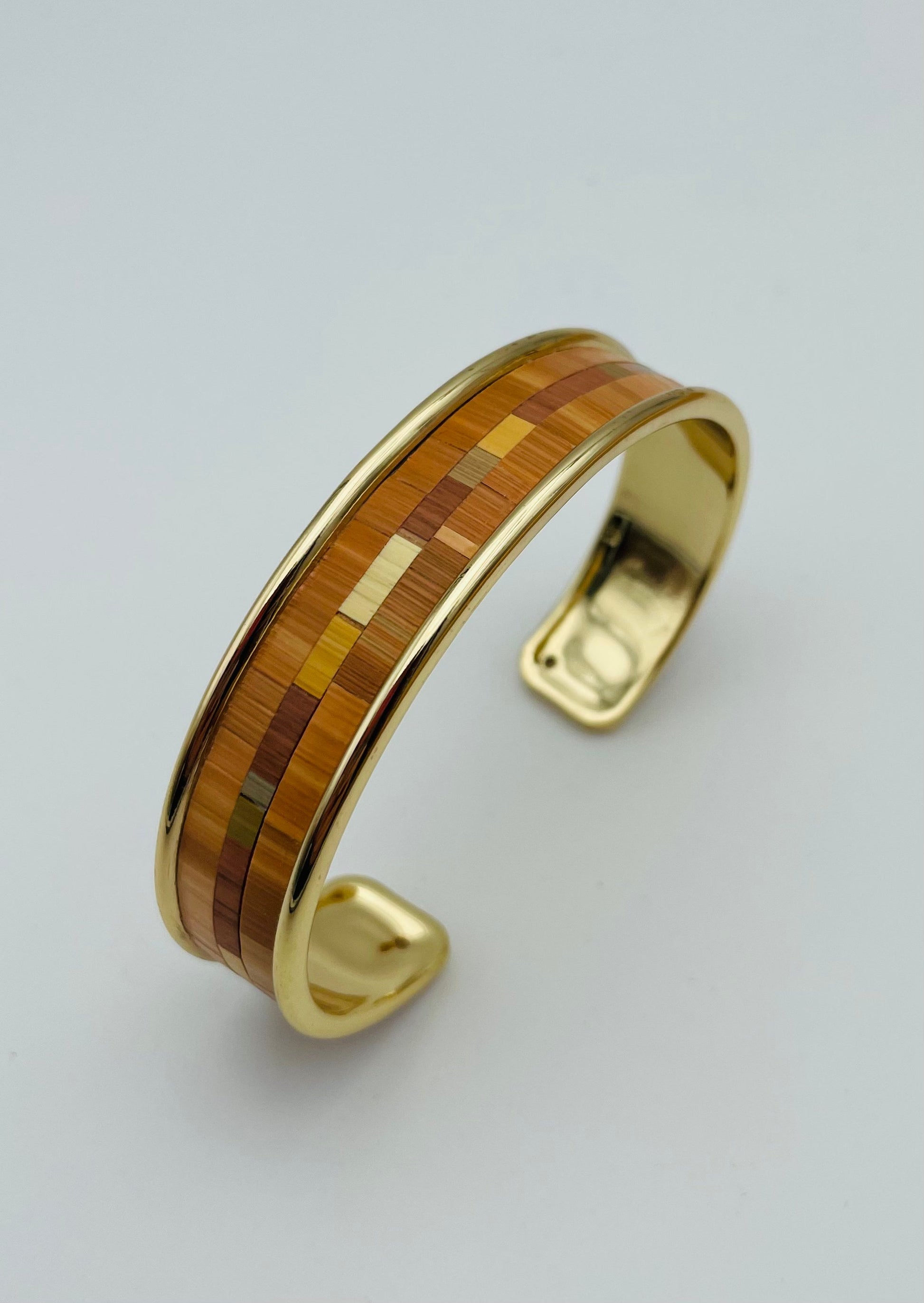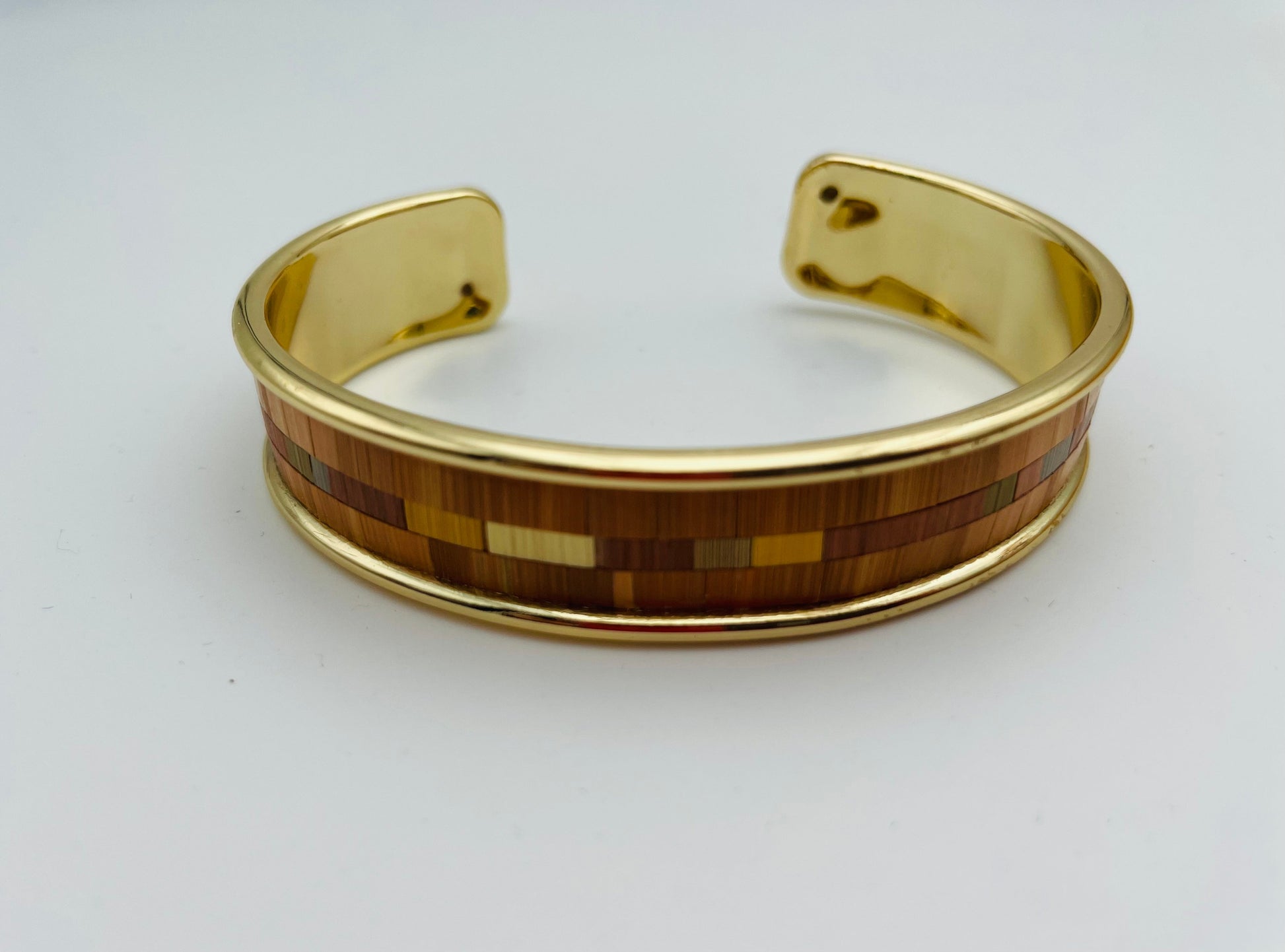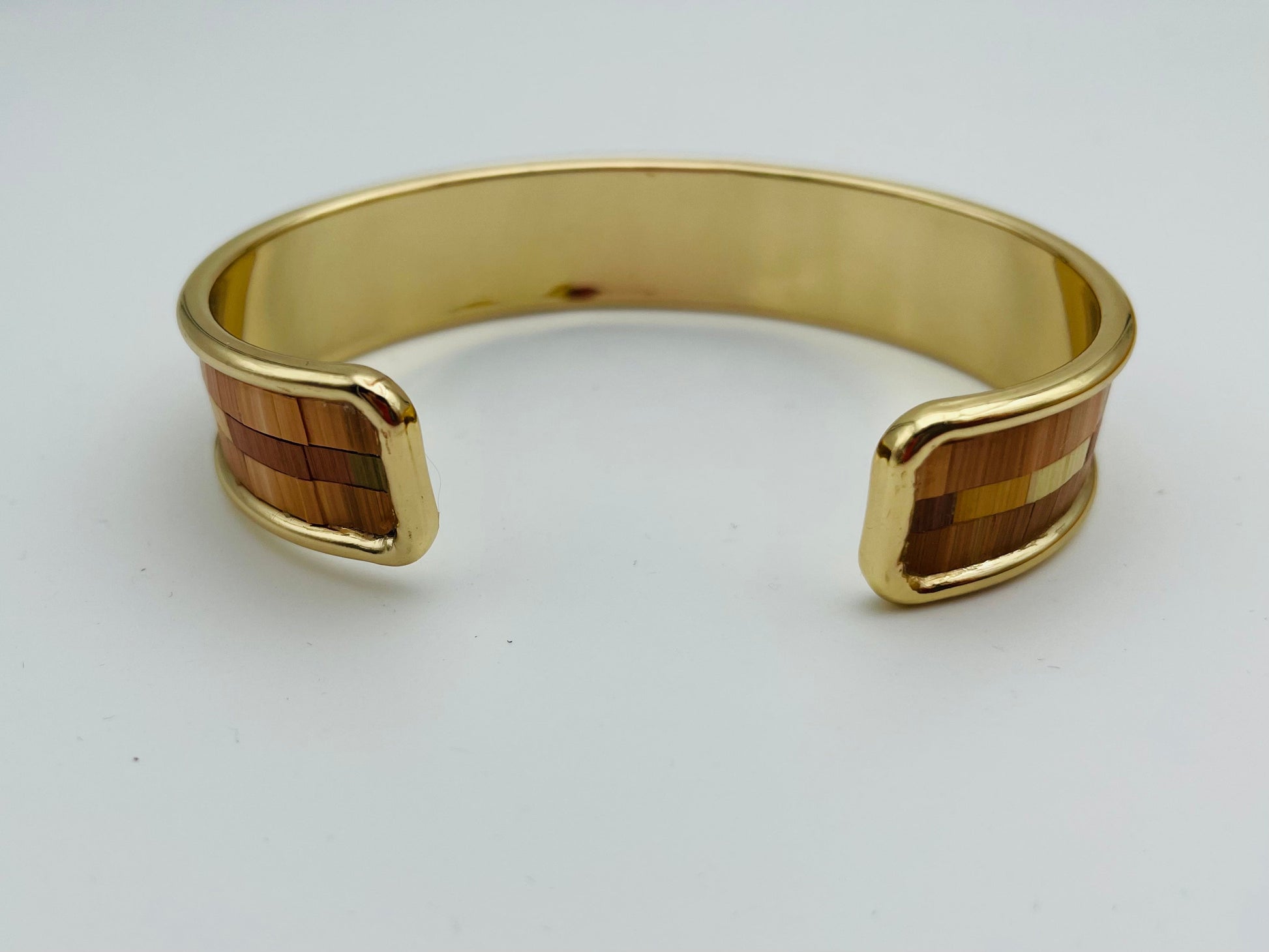 Manchette ajustable en laiton doré taille moyenne recouverte de marqueterie de paille