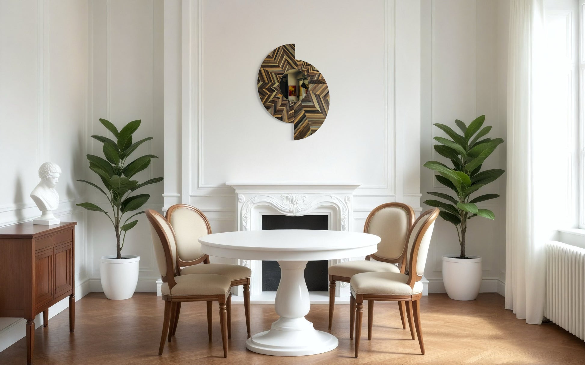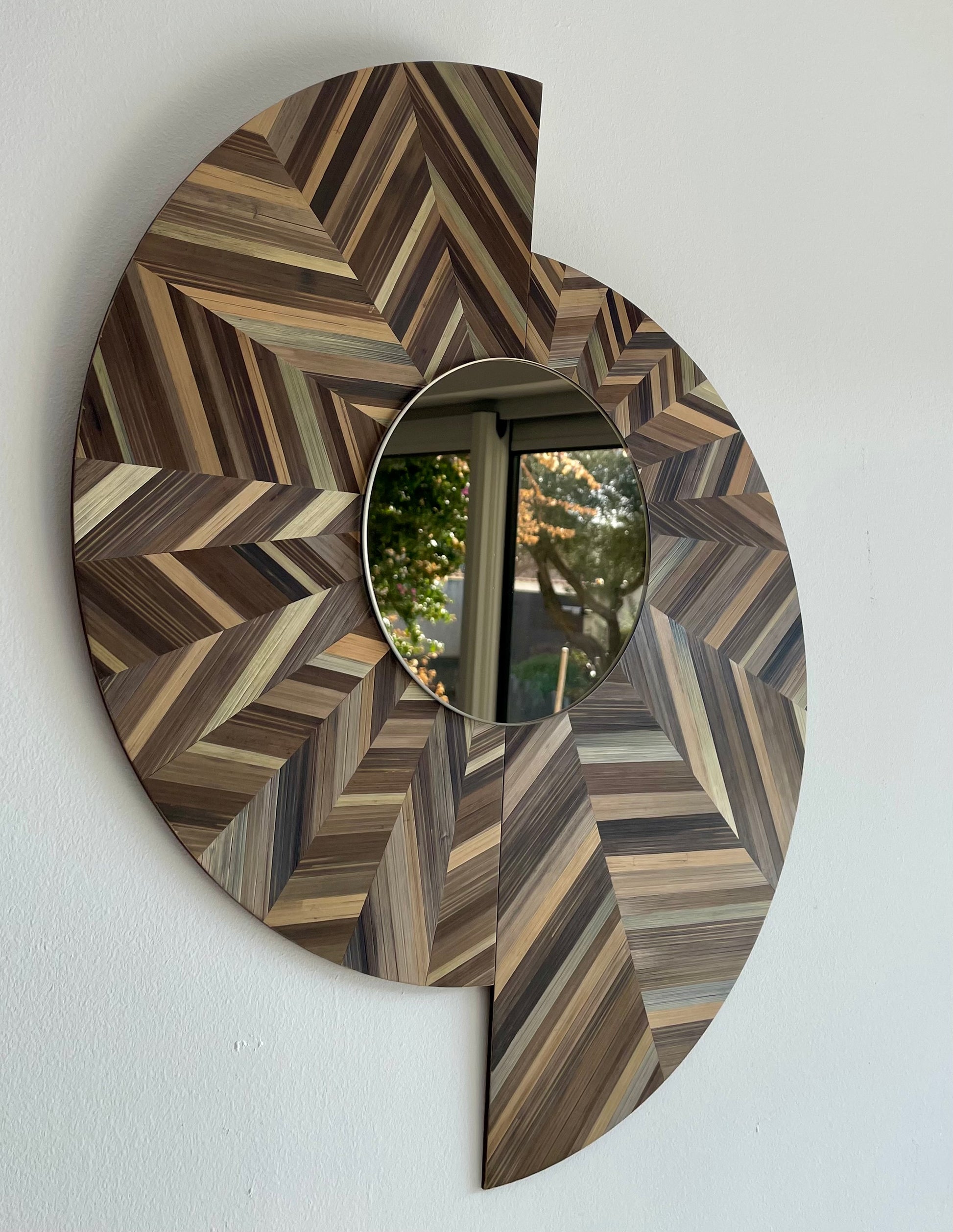 Ce miroir déstructuré avec une marqueterie de paille présente un ton chaud et chatoyant pour un effet luxueux. Son mélange chocolat crée une lumière et des reflets saisissants, ajoutant une touche d'élégance à n'importe quelle pièce.