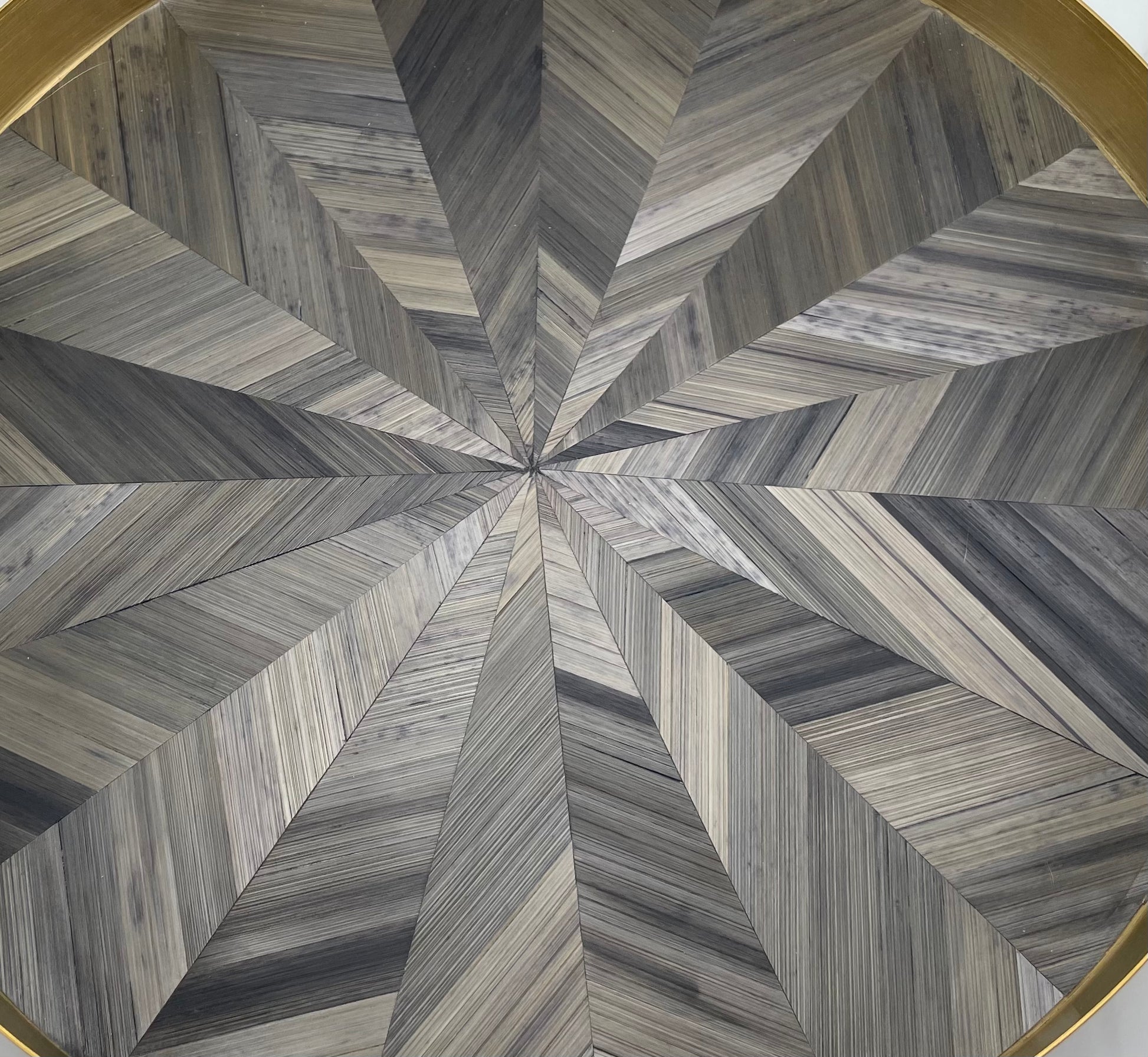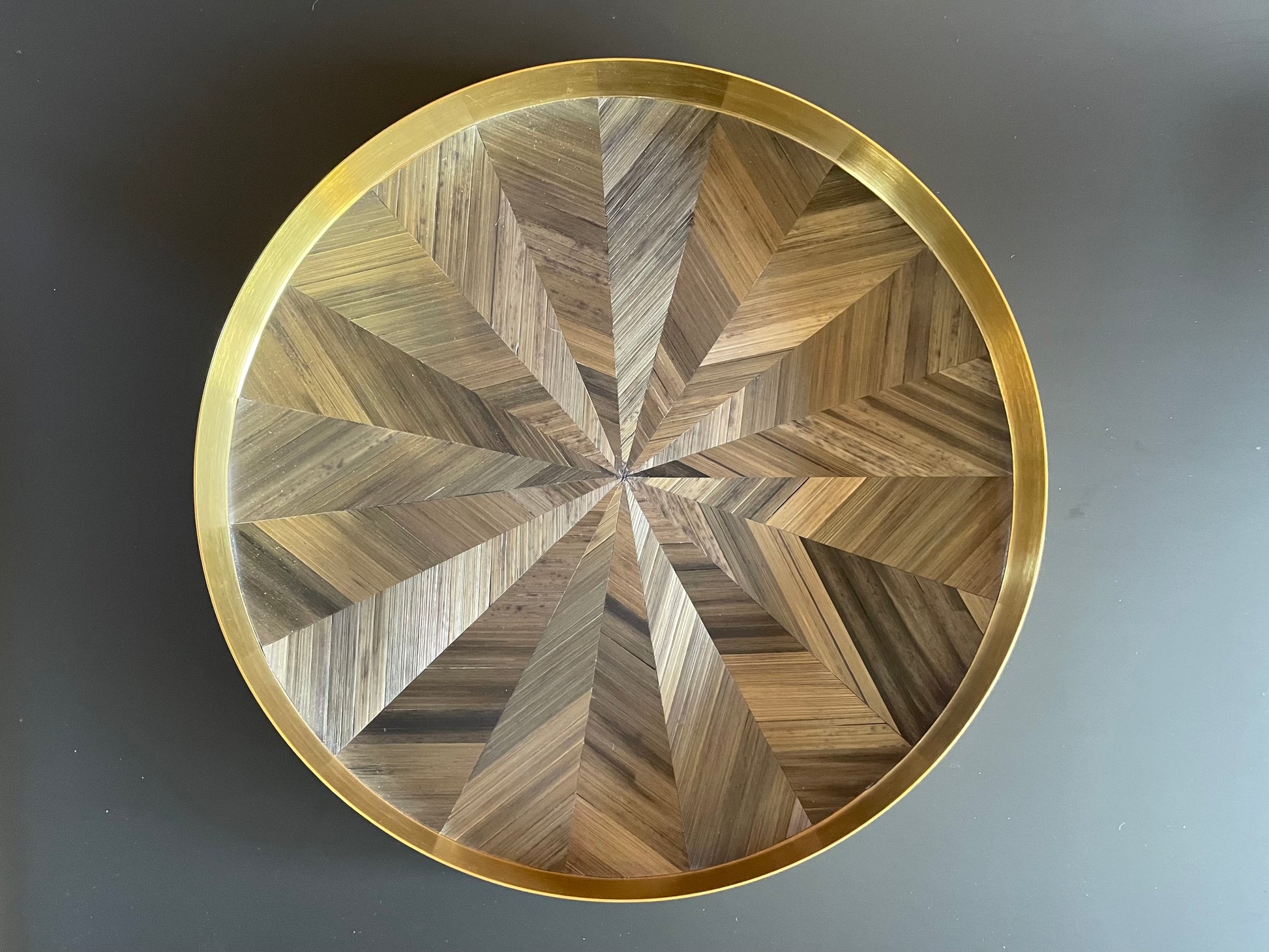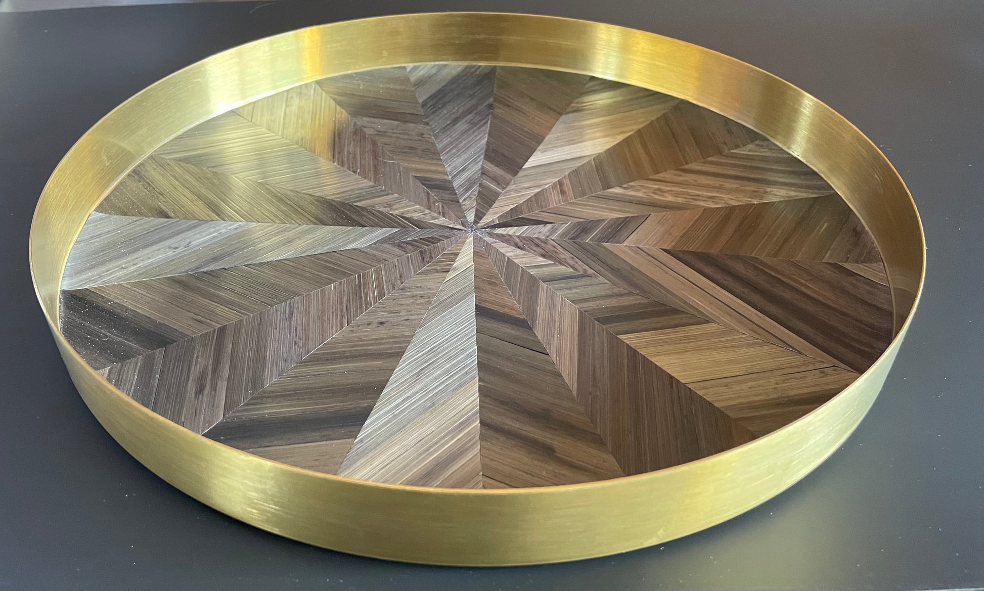 Ce plateau de luxe est fabriqué en acier inoxydable finition laiton brossé et revêtu de marqueterie de paille aux teintes chatoyantes de gris anthracite .