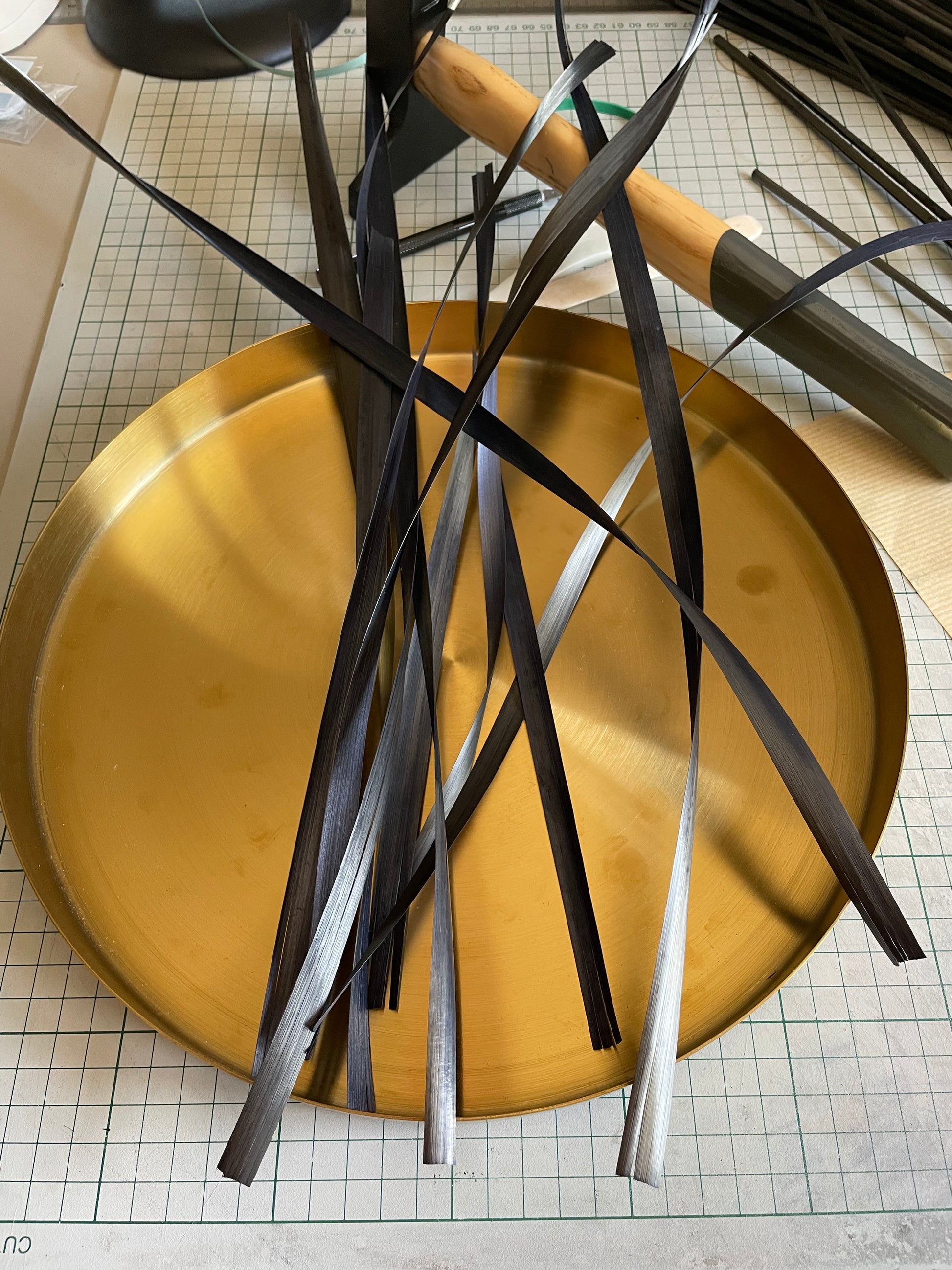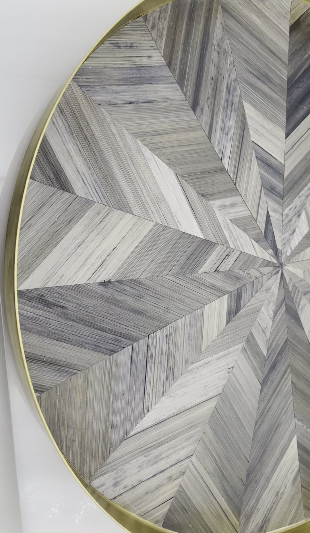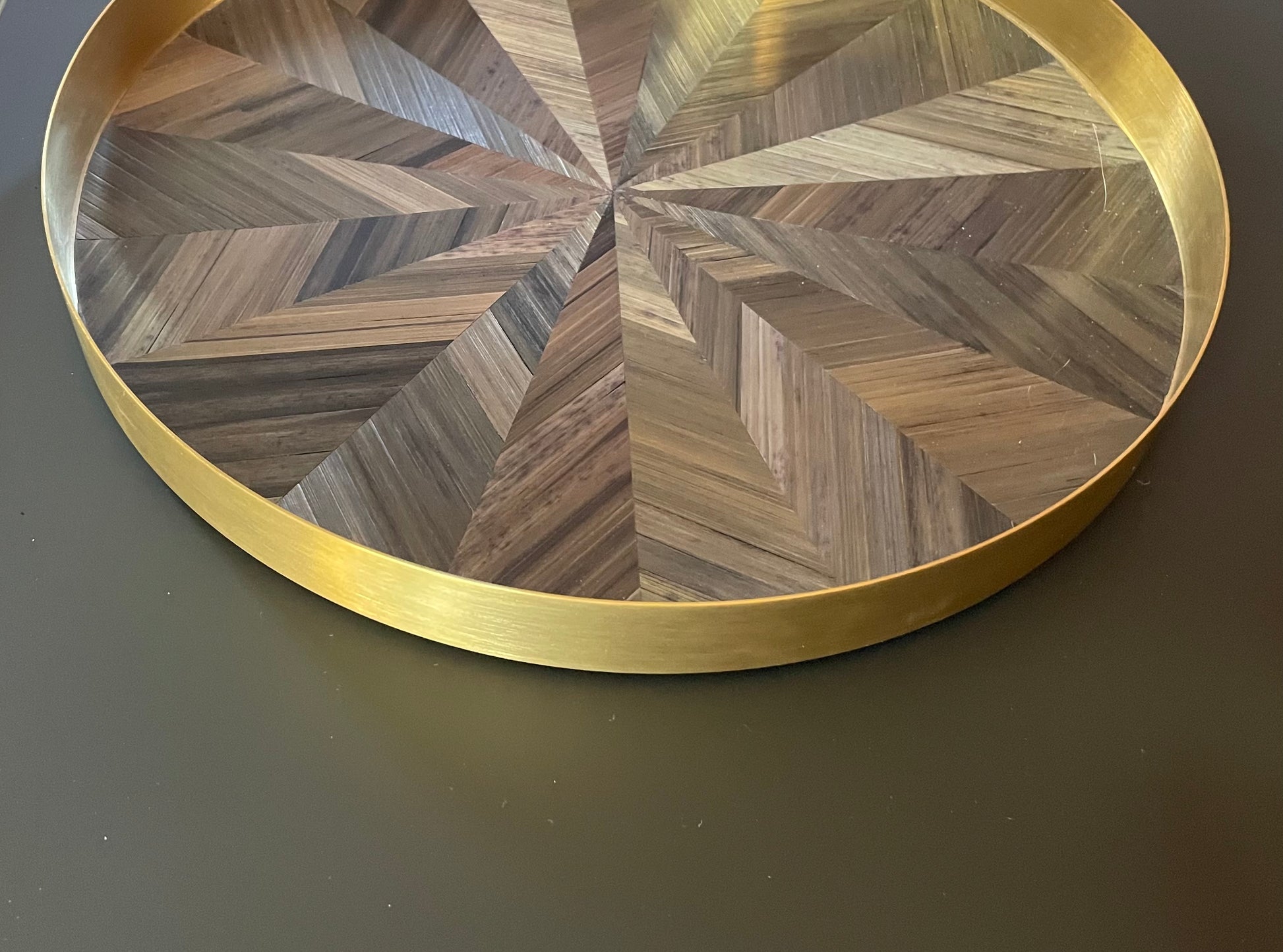 Ce plateau de luxe est fabriqué en acier inoxydable finition laiton brossé et revêtu de marqueterie de paille aux teintes chatoyantes de gris anthracite .