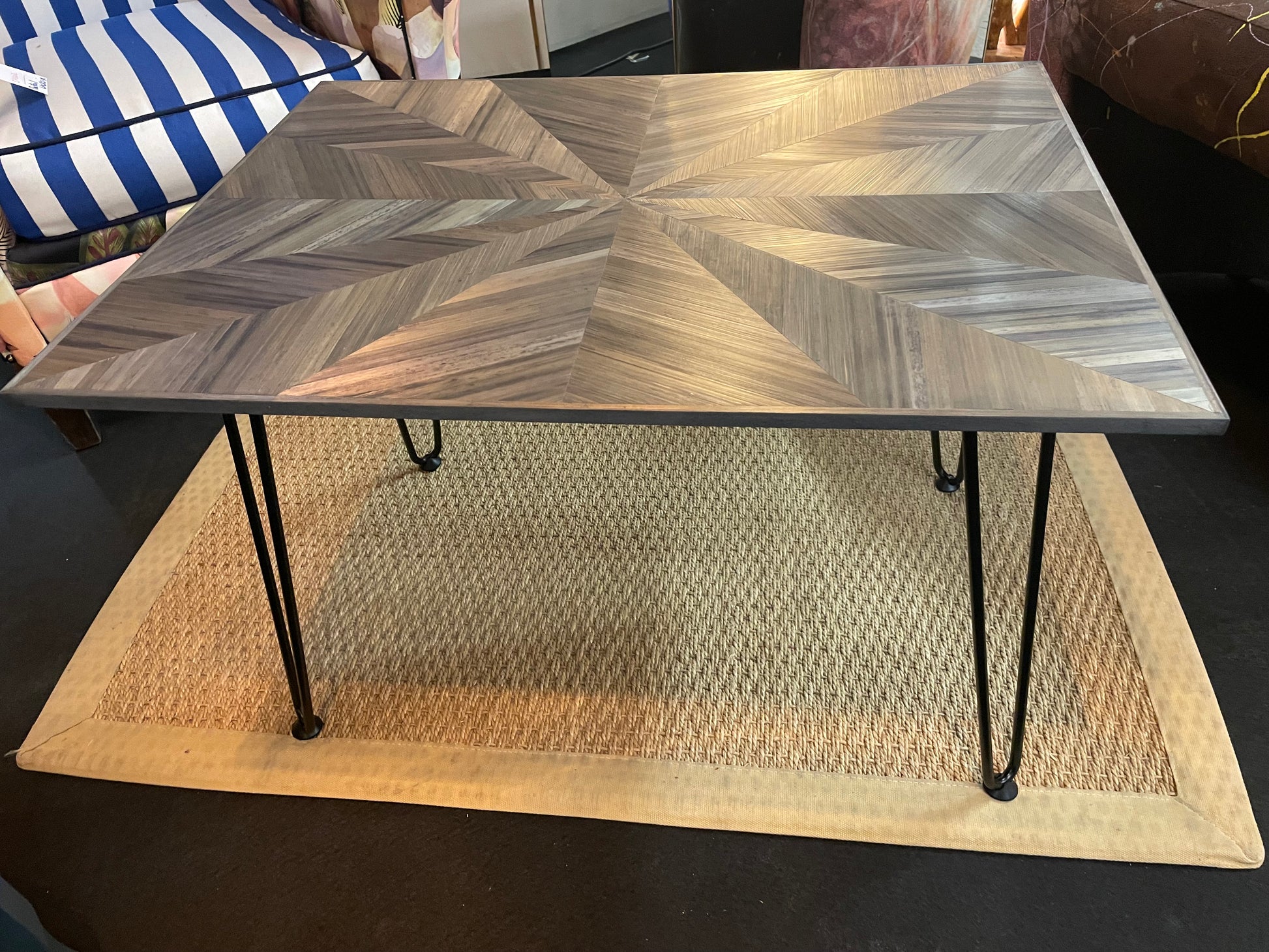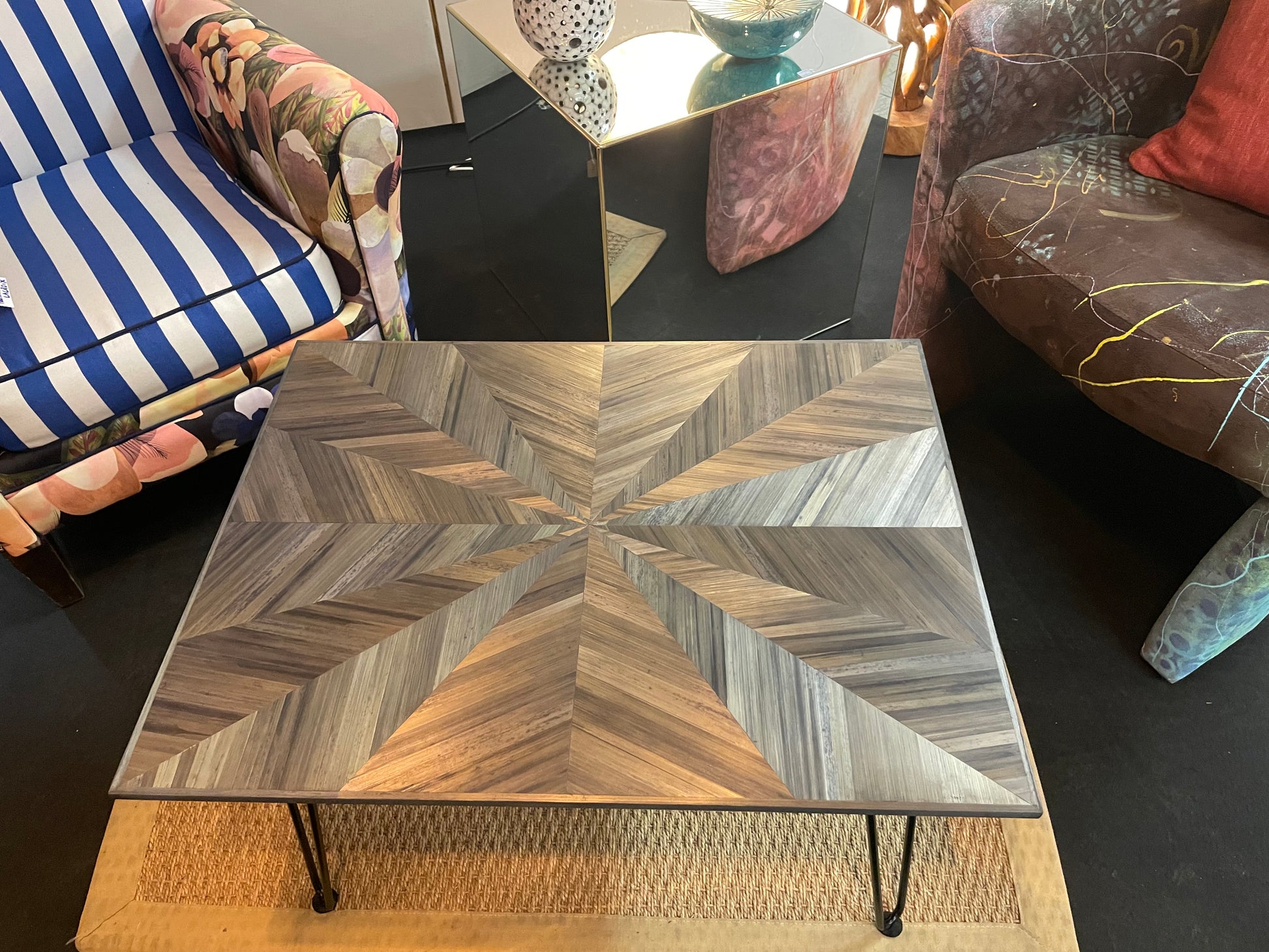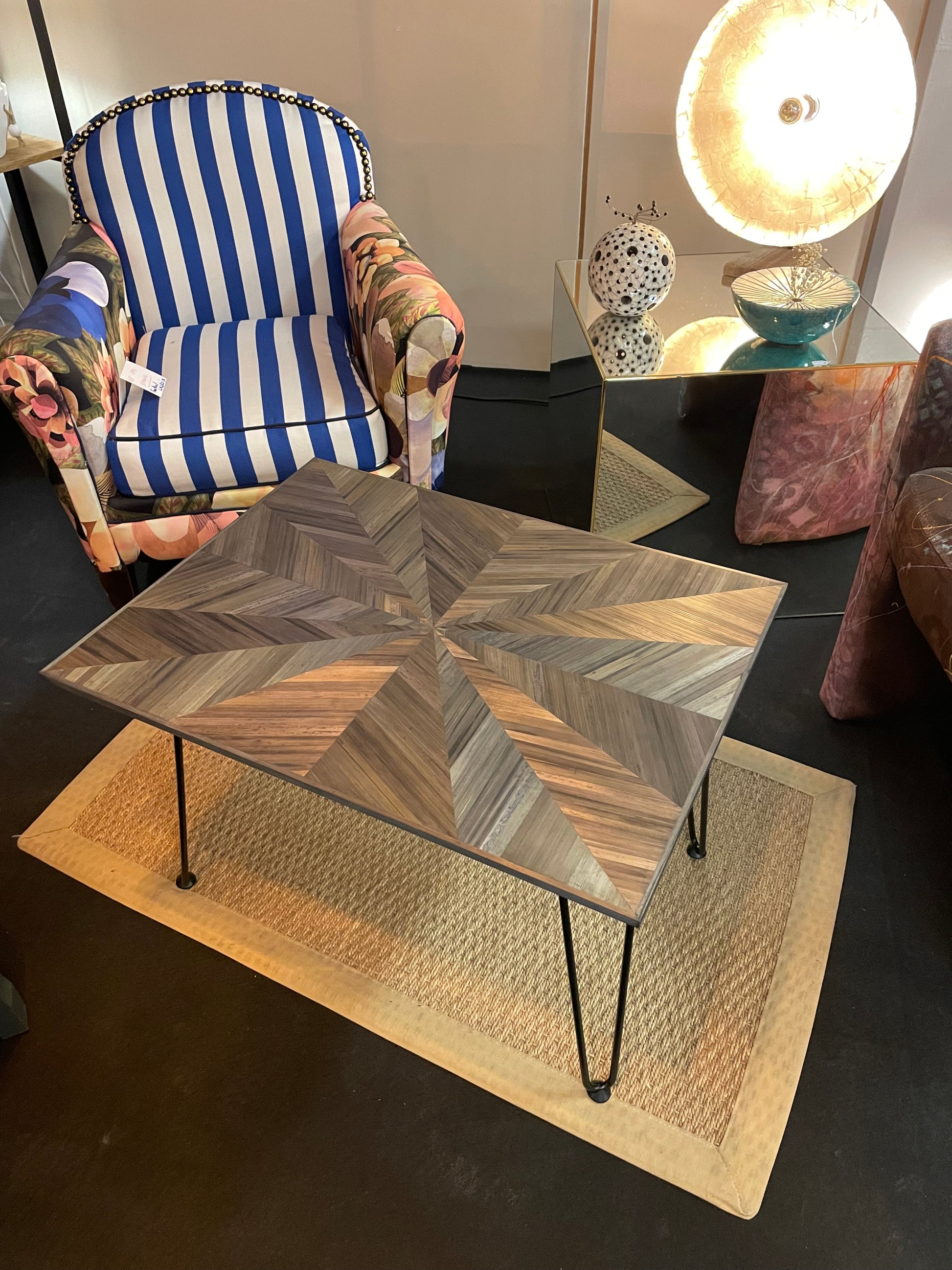 L'authenticité du savoir-faire artisanal se retrouve dans chaque détail, révélant la richesse des teintes naturelles et le dynamisme du motif géométrique. Soutenue par un piètement en metal fin et aérien, cette table allie robustesse et légèreté, s’adaptant aussi bien à un intérieur contemporain qu’à un univers plus classique.