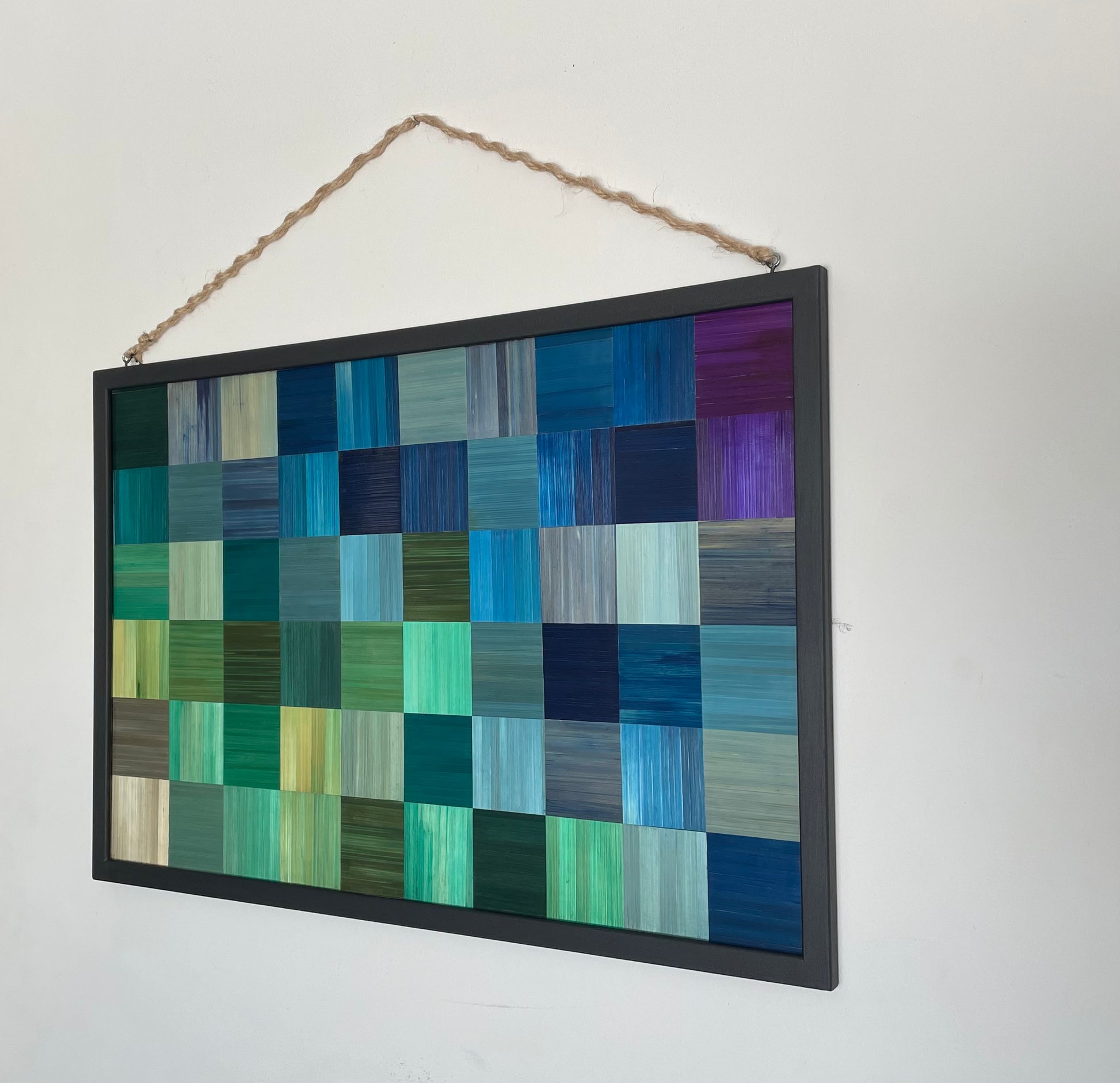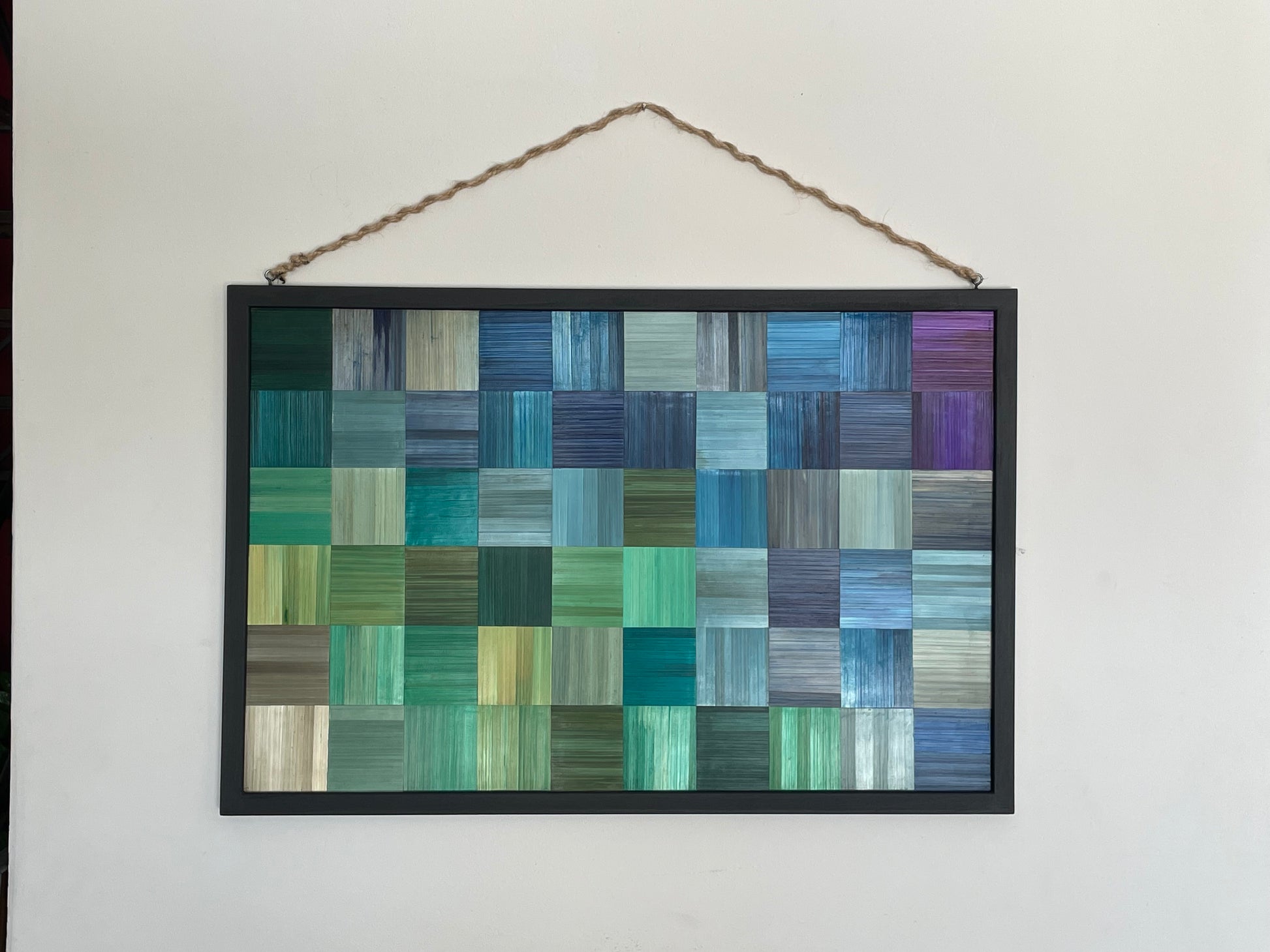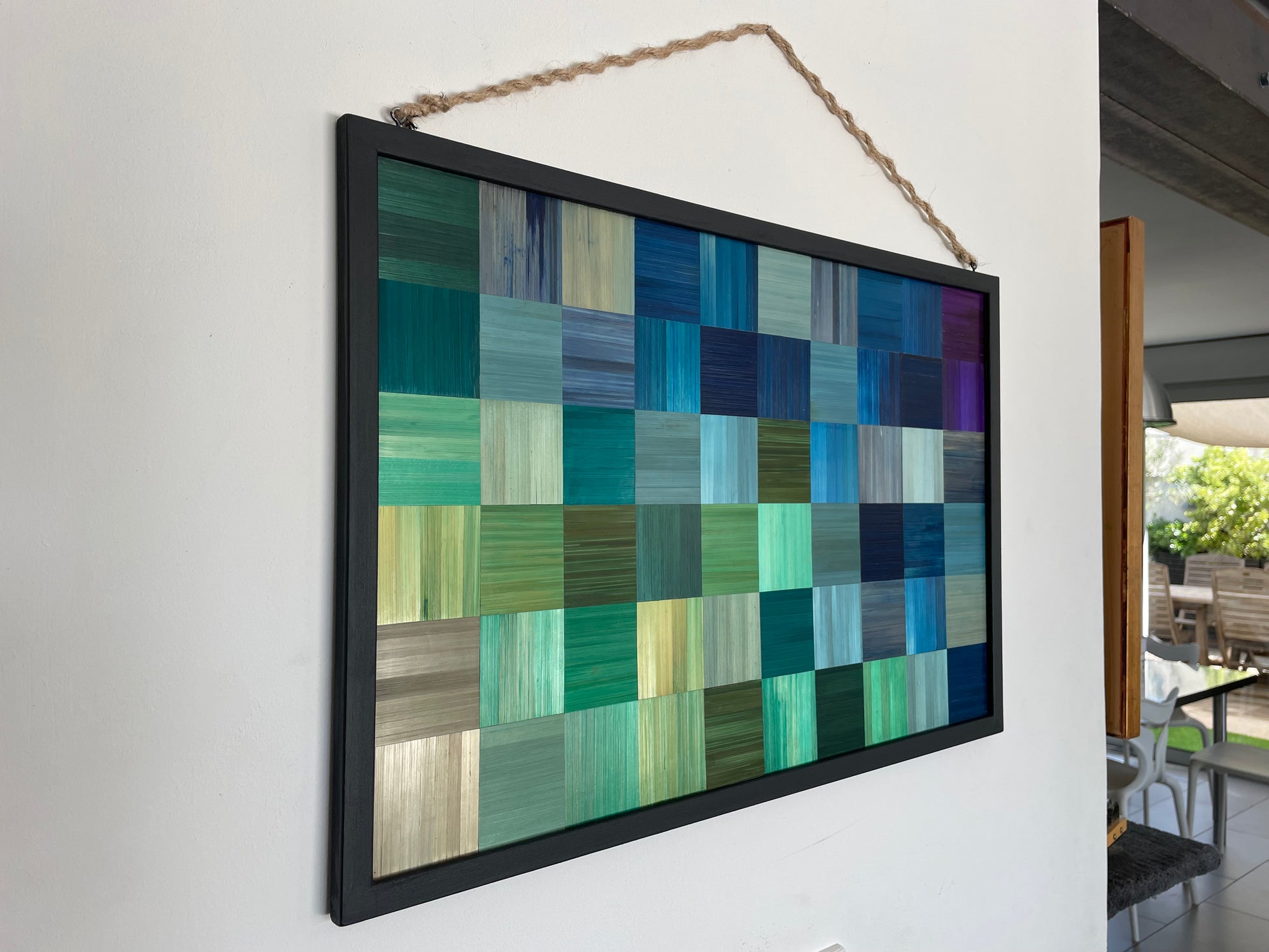 Sublimez votre décoration intérieure avec notre Damier en bleu et vert, un tableau élégant de 40/60cm composé d'une marqueterie de paille précieuse et lumineuse.
