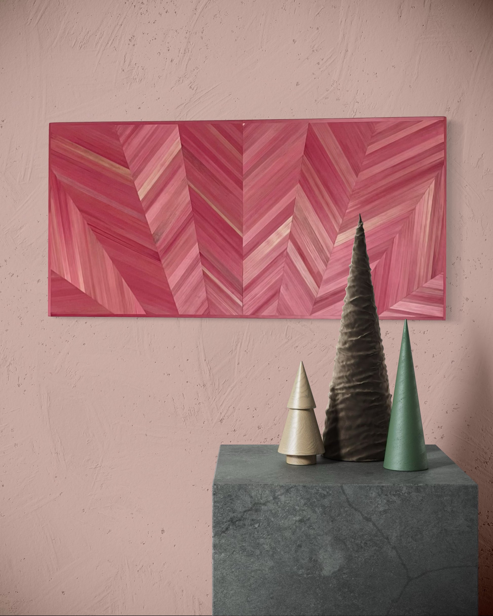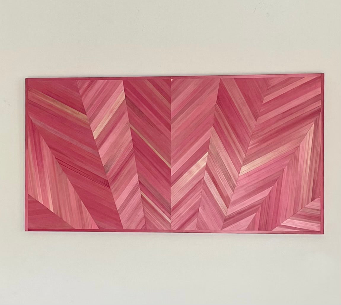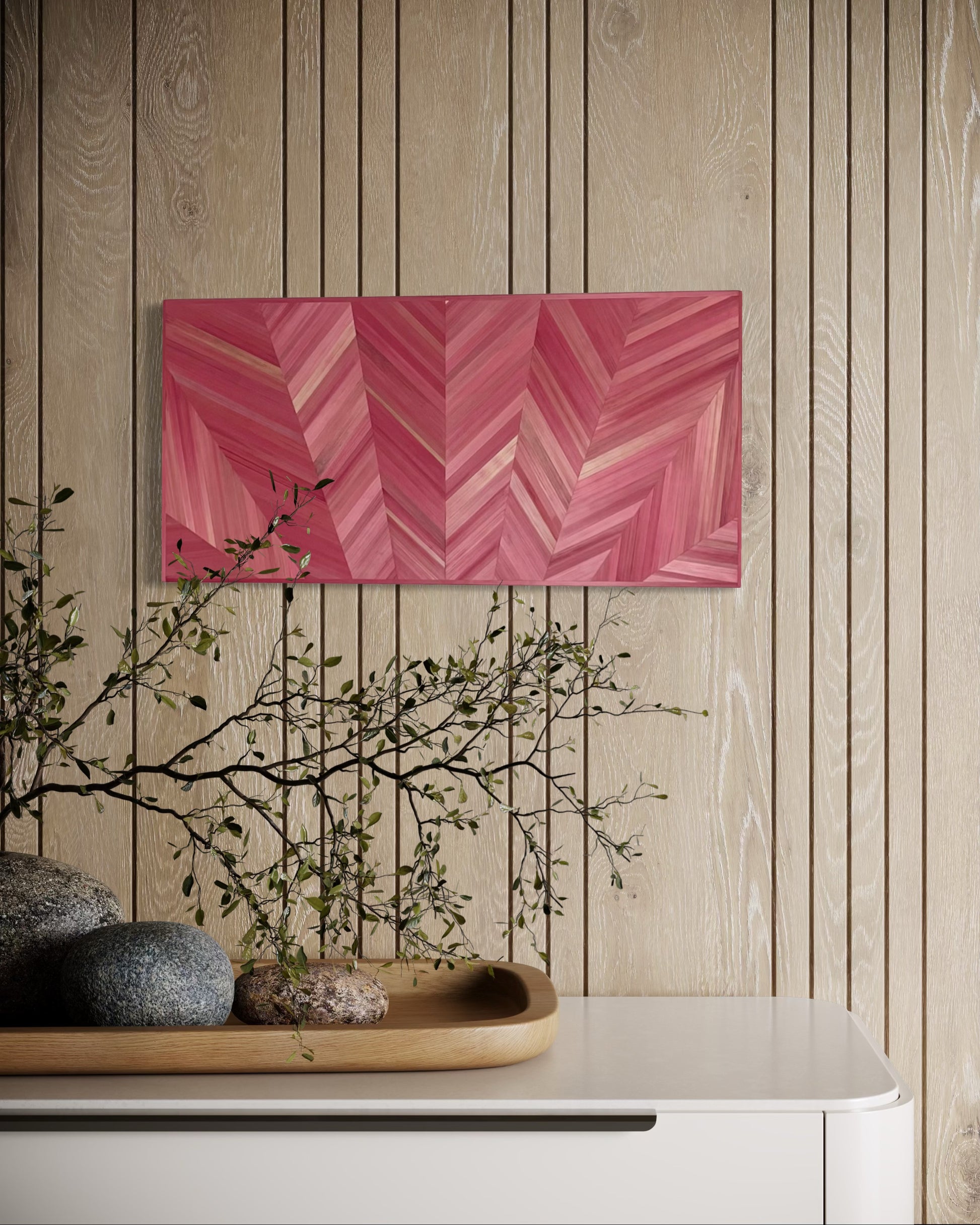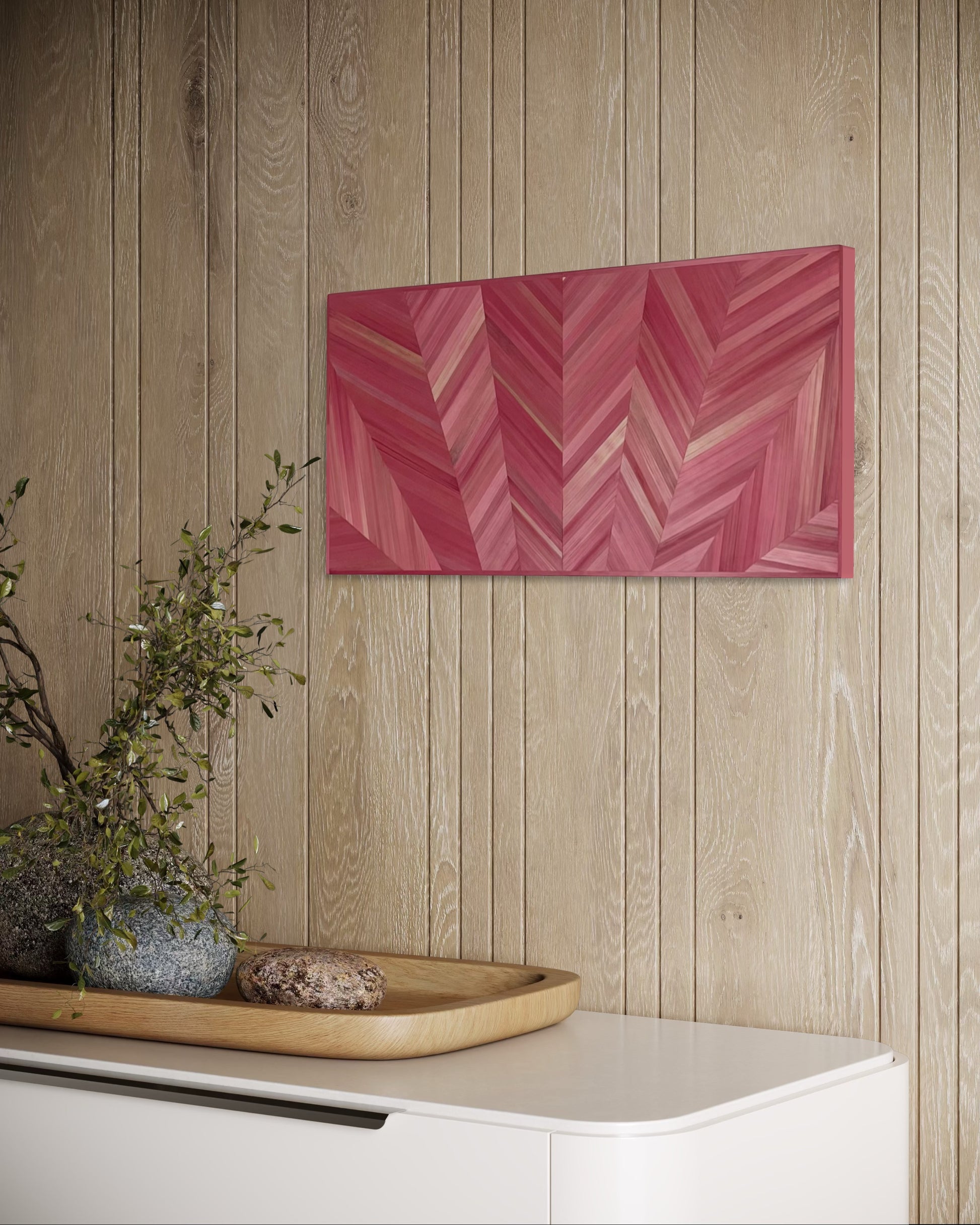 Découvrez l'Envolée rose, un tableau en marqueterie de paille rose avec un motif de chevrons concentriques pour un effet volumineux et texturé. Ajoutez une touche sophistiquée à votre décoration avec cette pièce exclusive qui invite à voir la vie en rose.