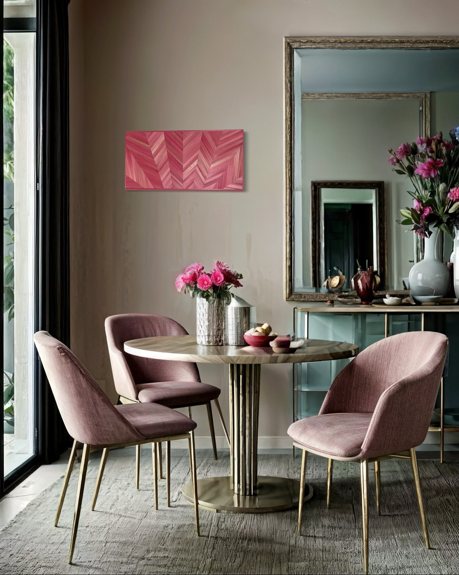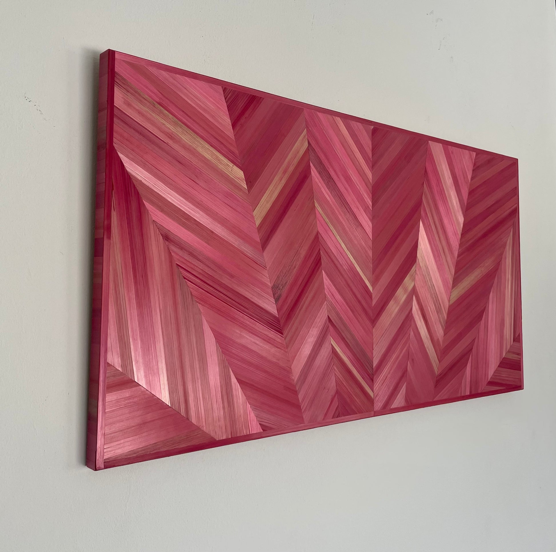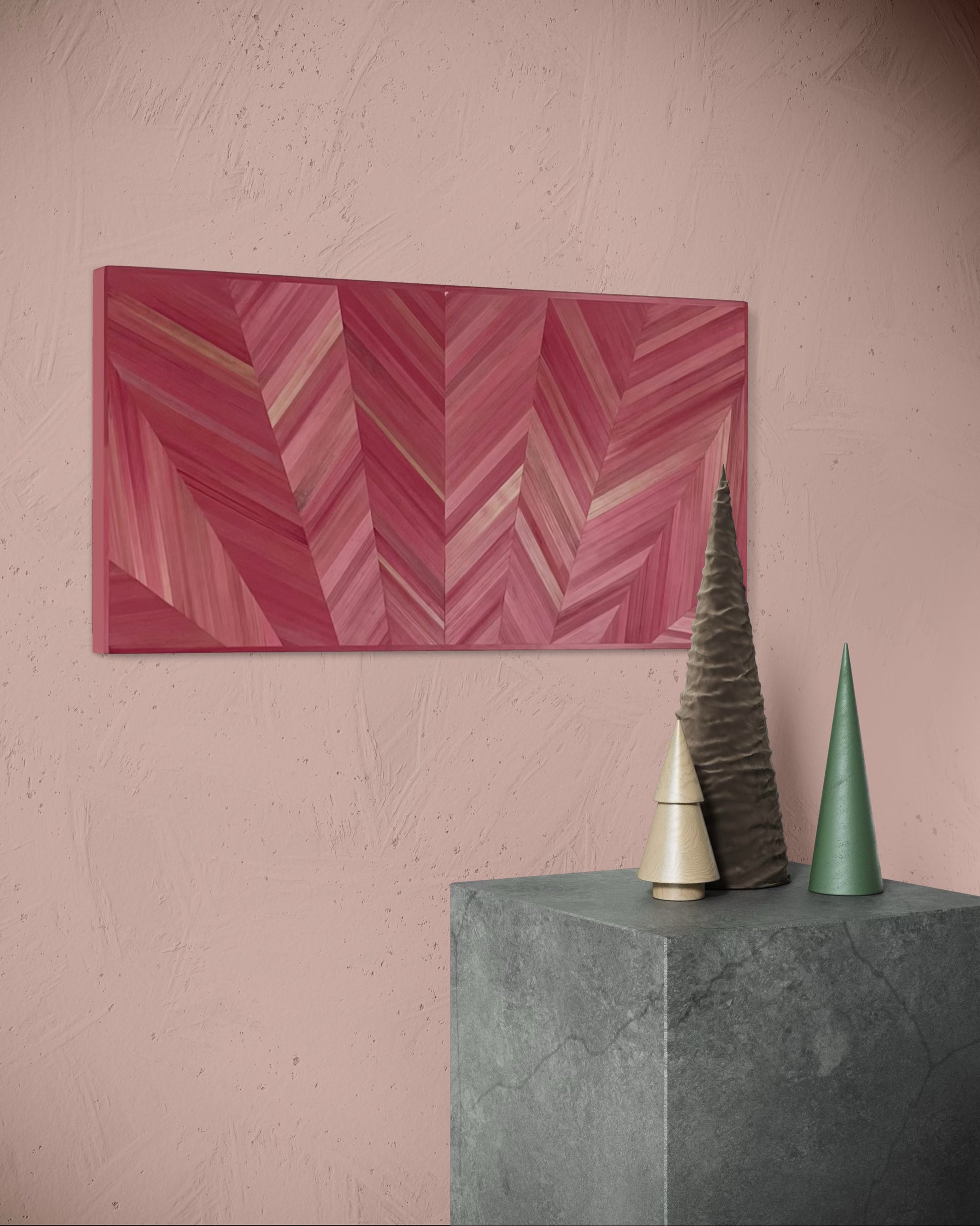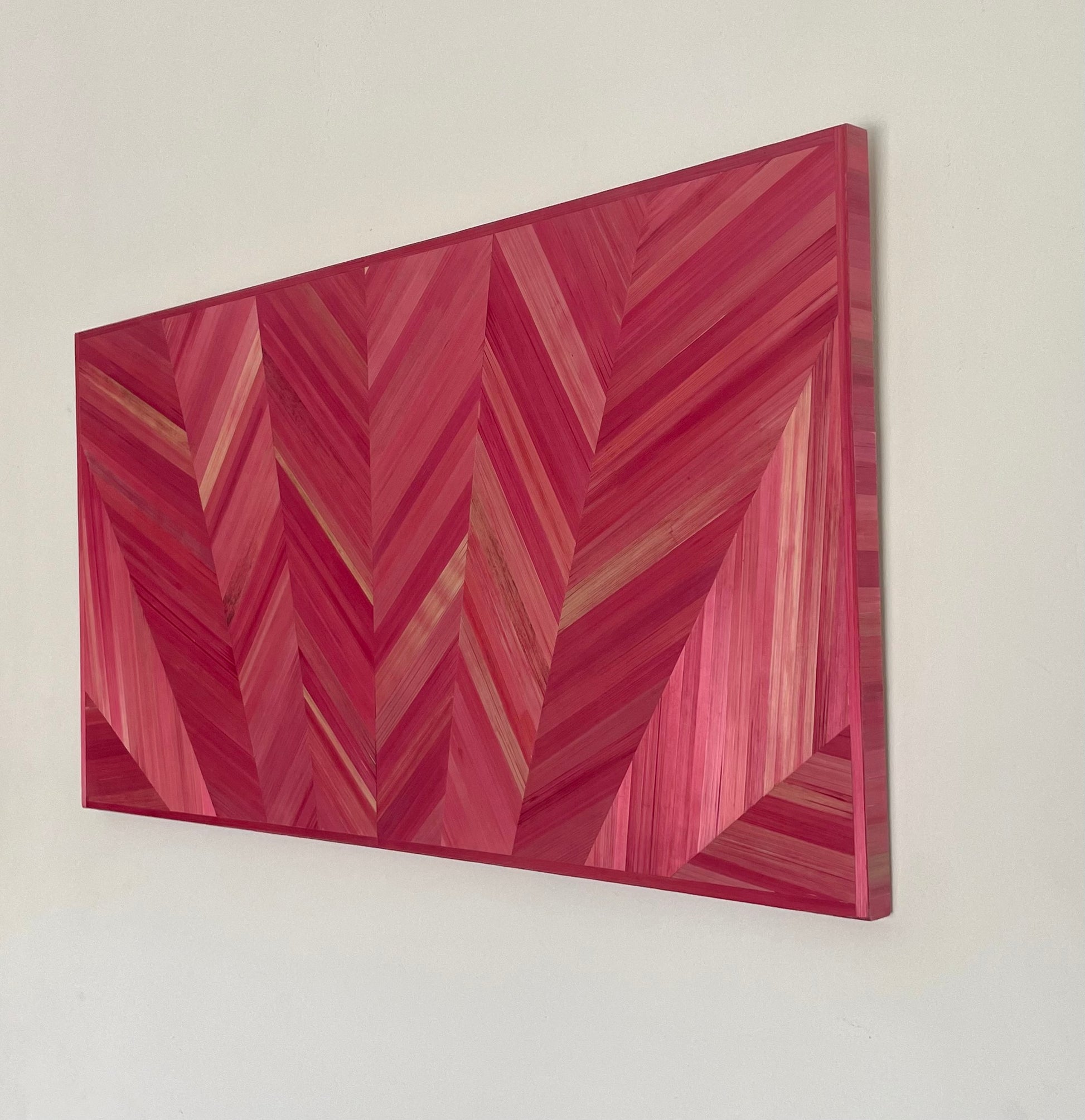 Découvrez l'Envolée rose, un tableau en marqueterie de paille rose avec un motif de chevrons concentriques pour un effet volumineux et texturé. Ajoutez une touche sophistiquée à votre décoration avec cette pièce exclusive qui invite à voir la vie en rose.