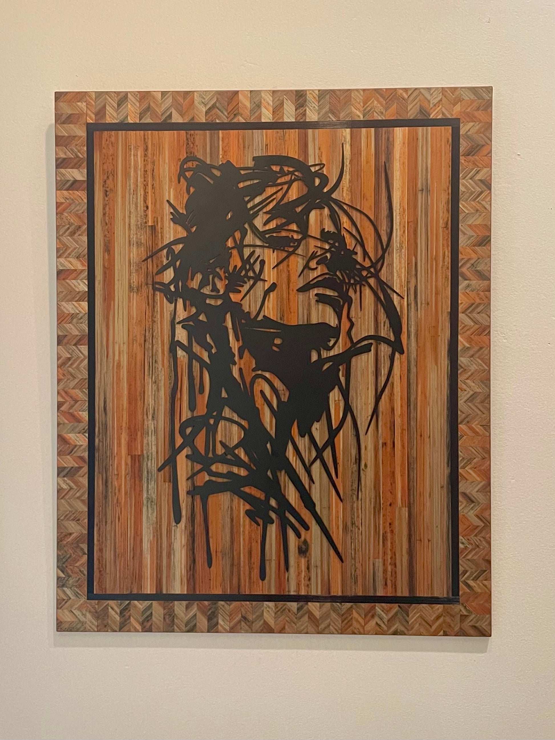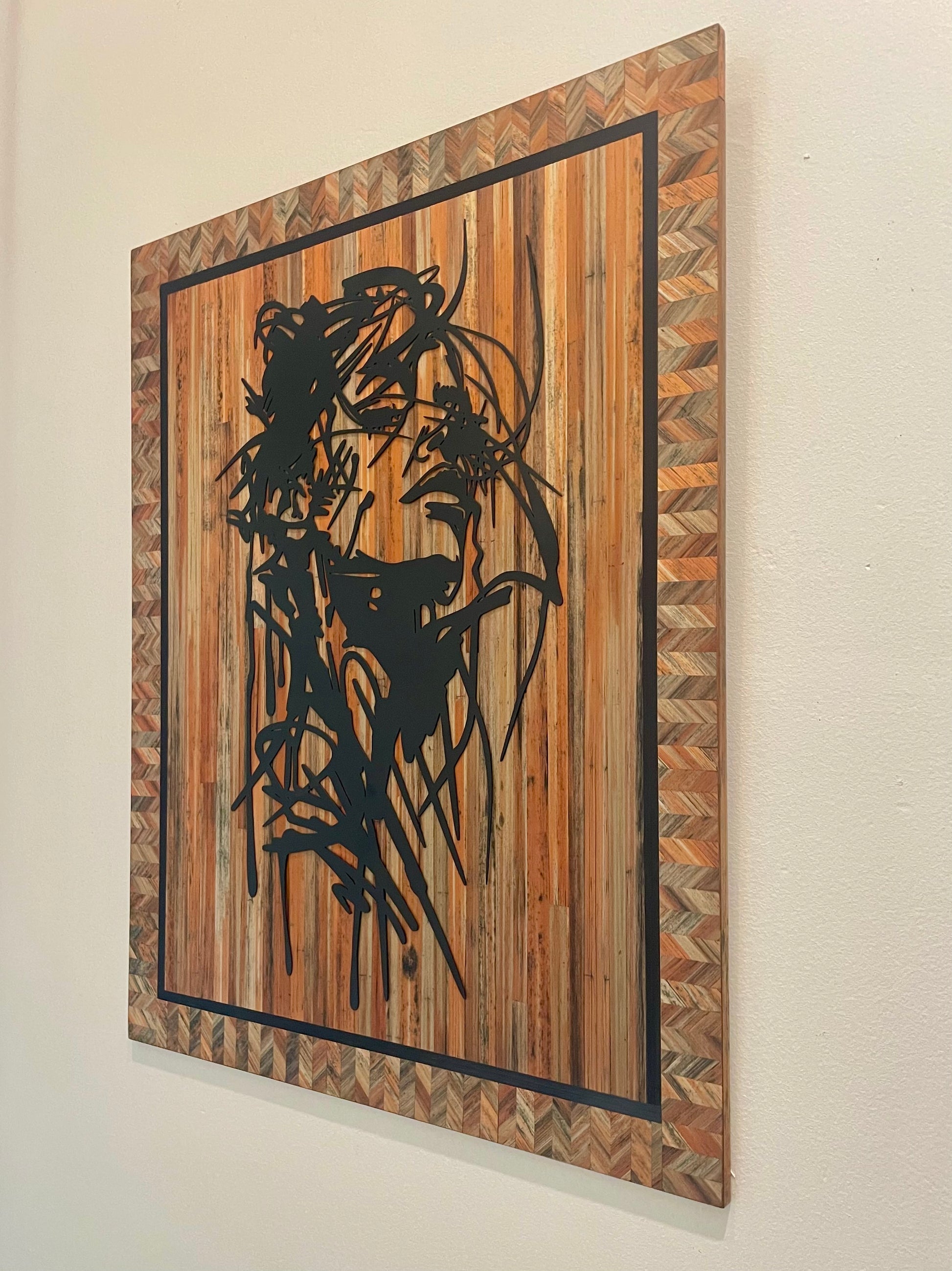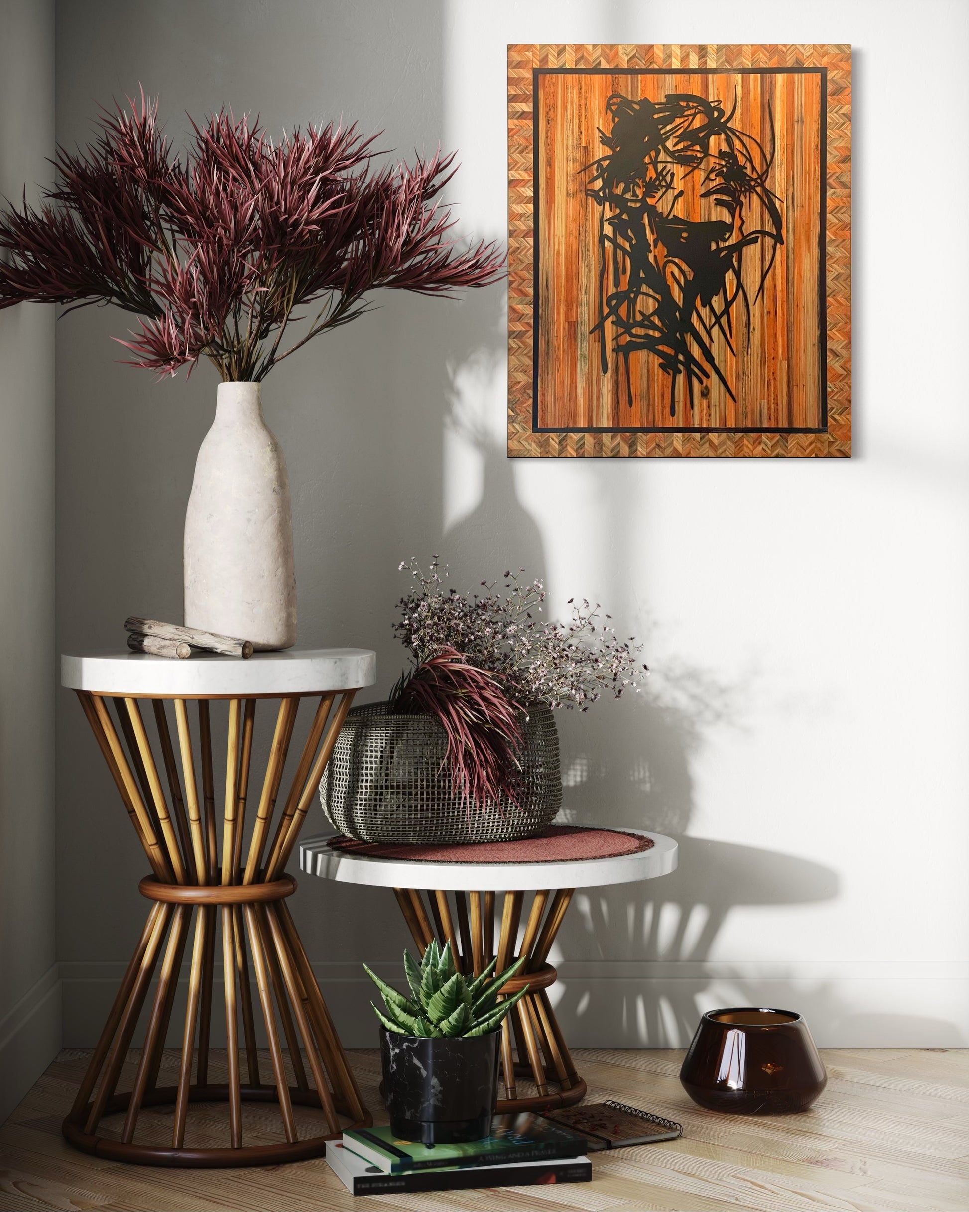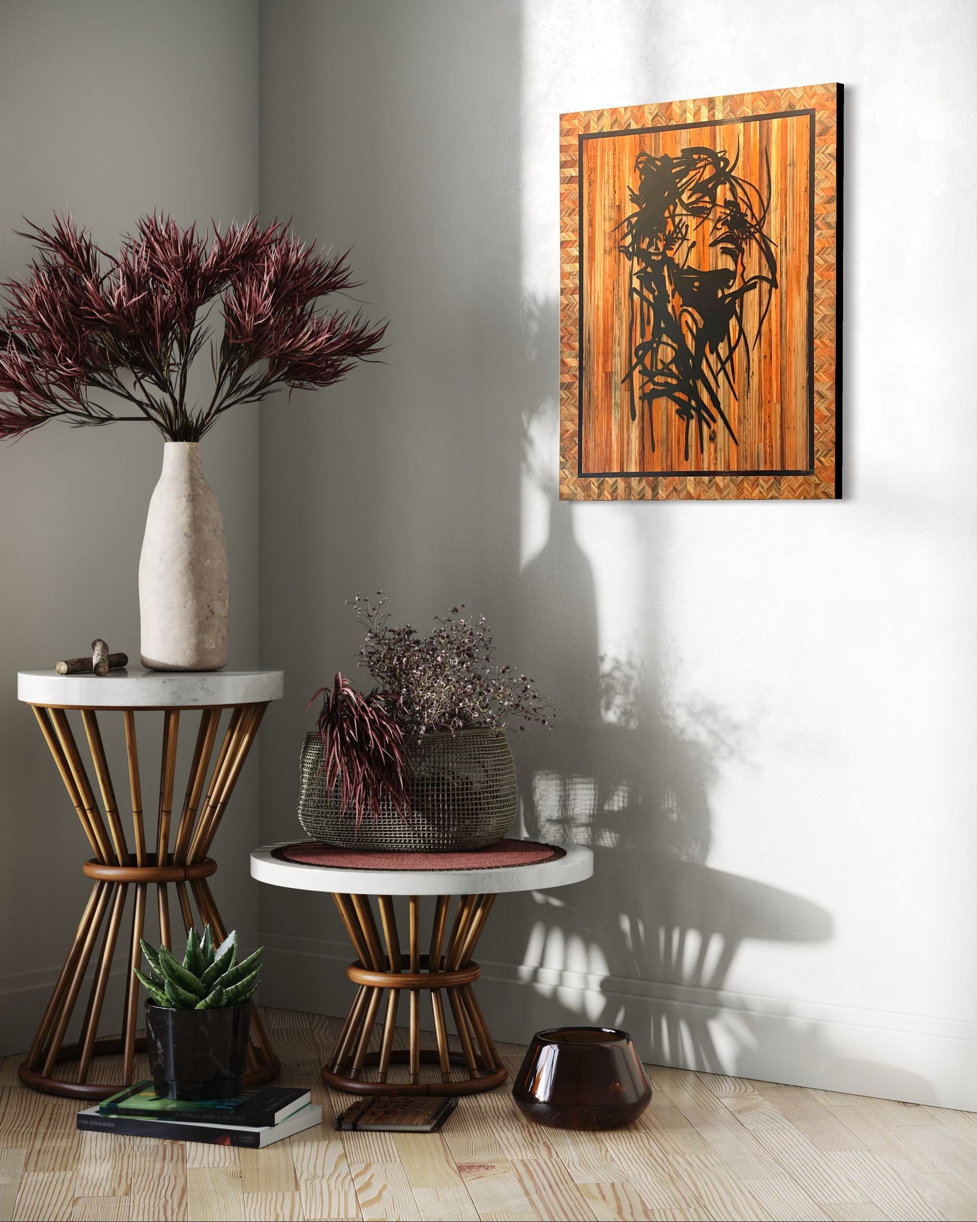 Par-dessus ce fond lumineux se détache une silhouette en métal noir découpé, dont les lignes fluides dessinent un portrait abstrait en pleine pensée. La dureté graphique du métal vient trancher la douceur de la paille, créant un contraste moderne saisissant.