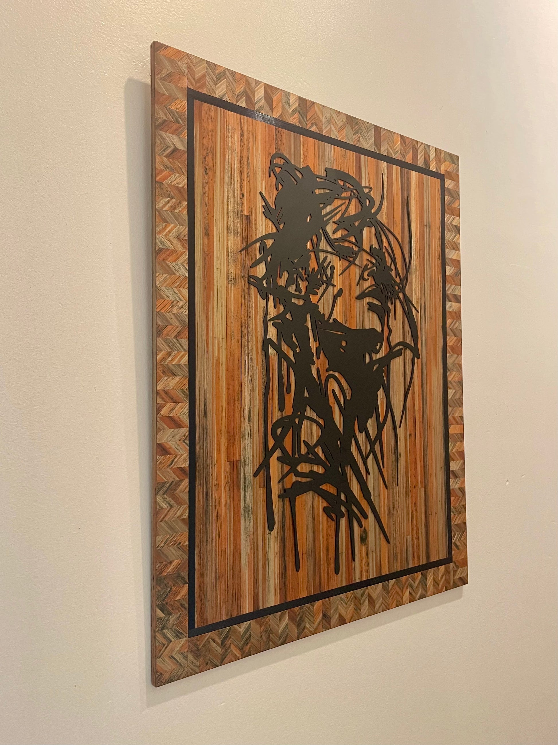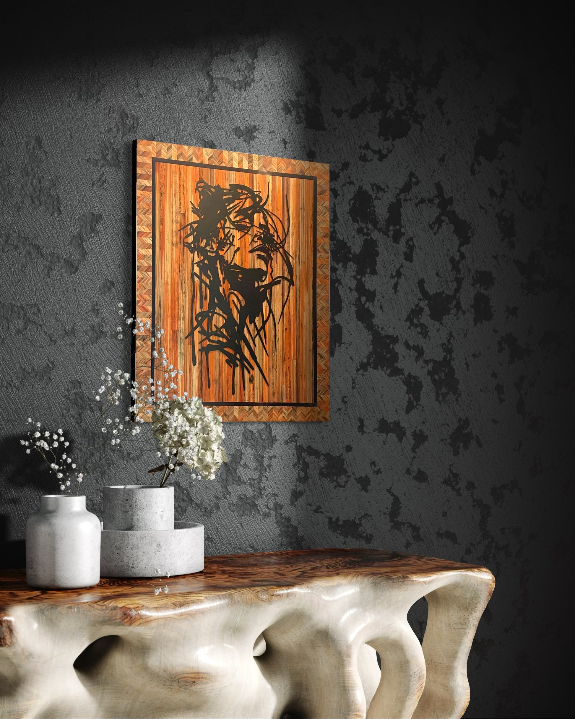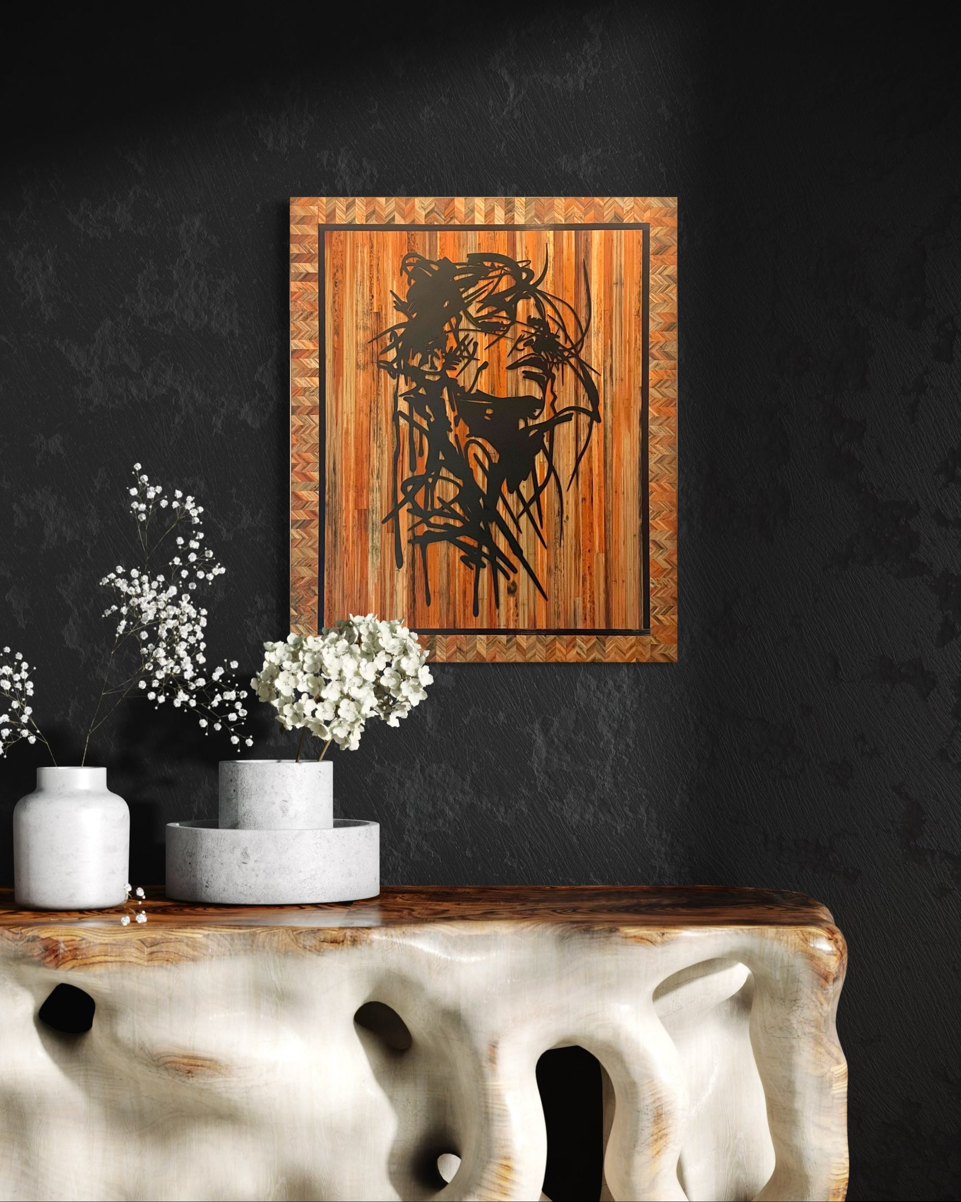 Cette pièce murale décorative est idéale pour les collectionneurs et les amateurs de décoration intérieure de luxe recherchant des œuvres uniques en bois et métal.