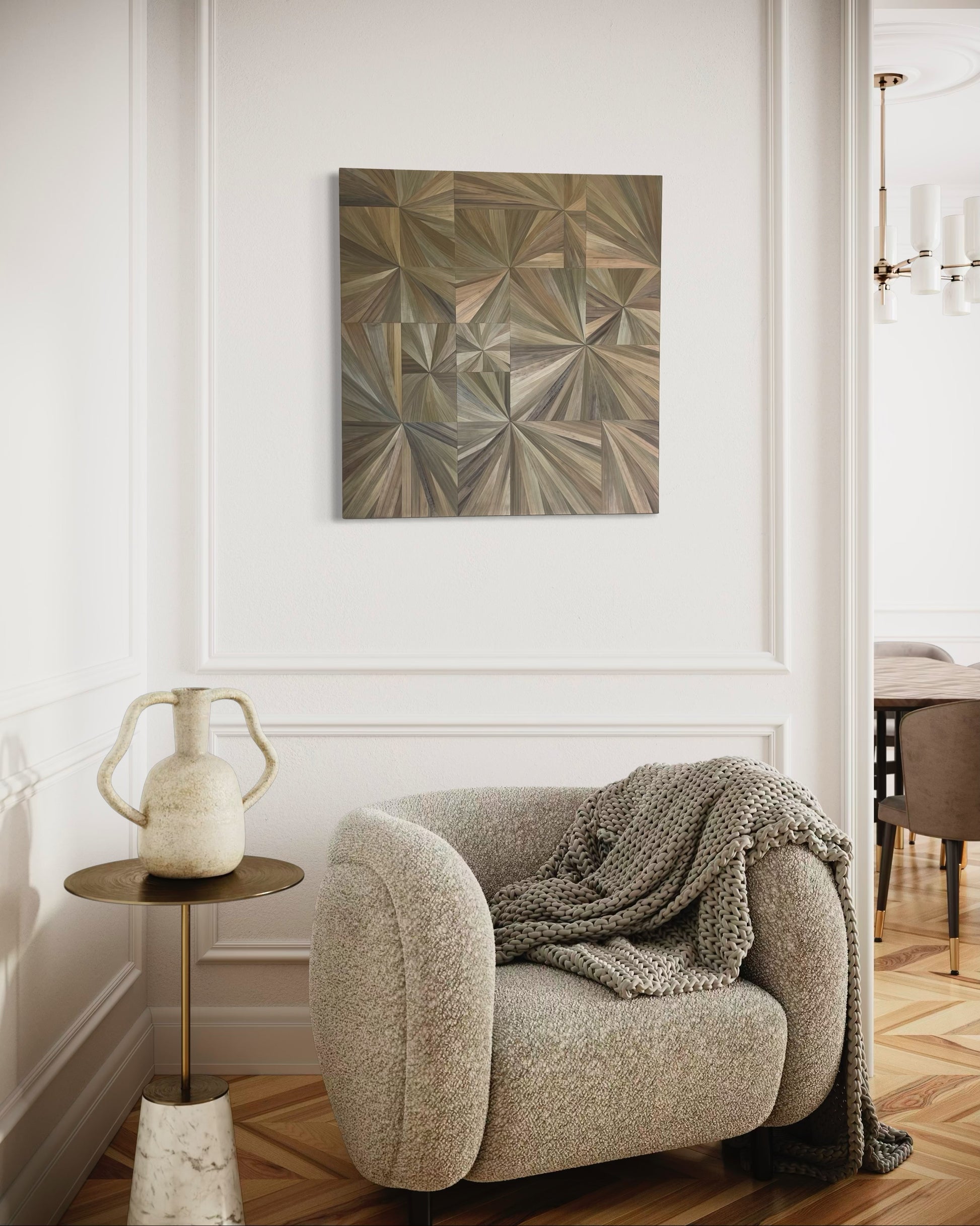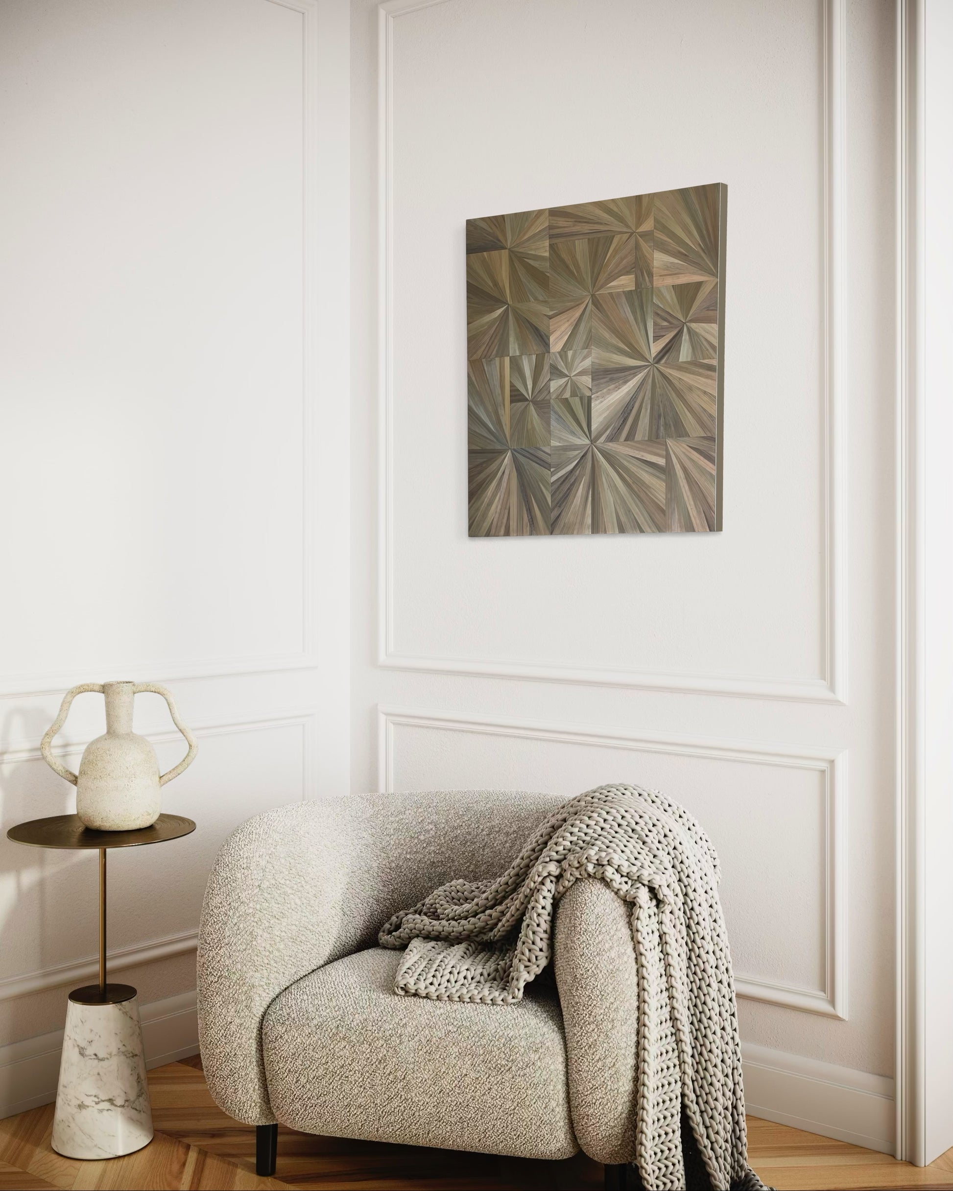 Plongez dans la chaleur et la douceur de notre Méli-mélo de soleil. Ce tableau en marqueterie de paille est un chef d'œuvre moderne contemporain avec des reflets flamboyants. Laissez-vous envoûter par sa beauté et ajoutez une touche d'élégance à votre intérieur.