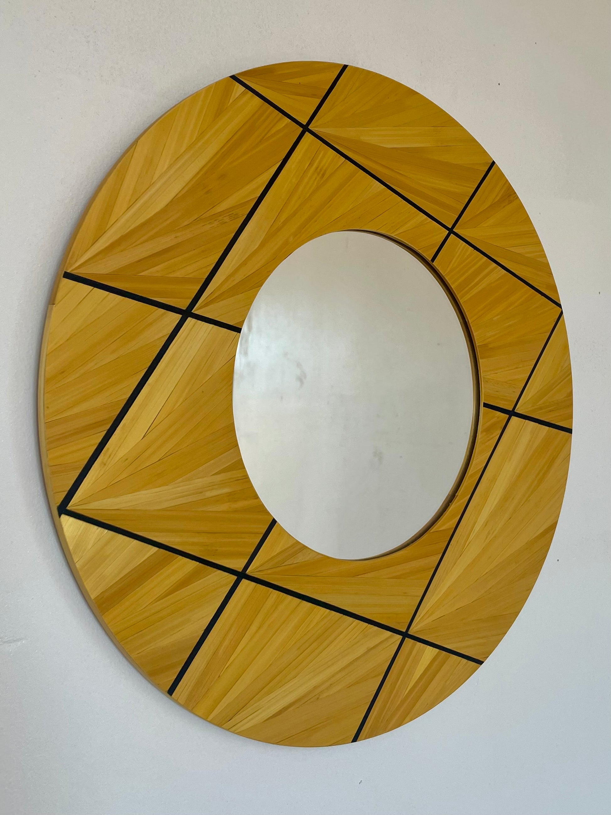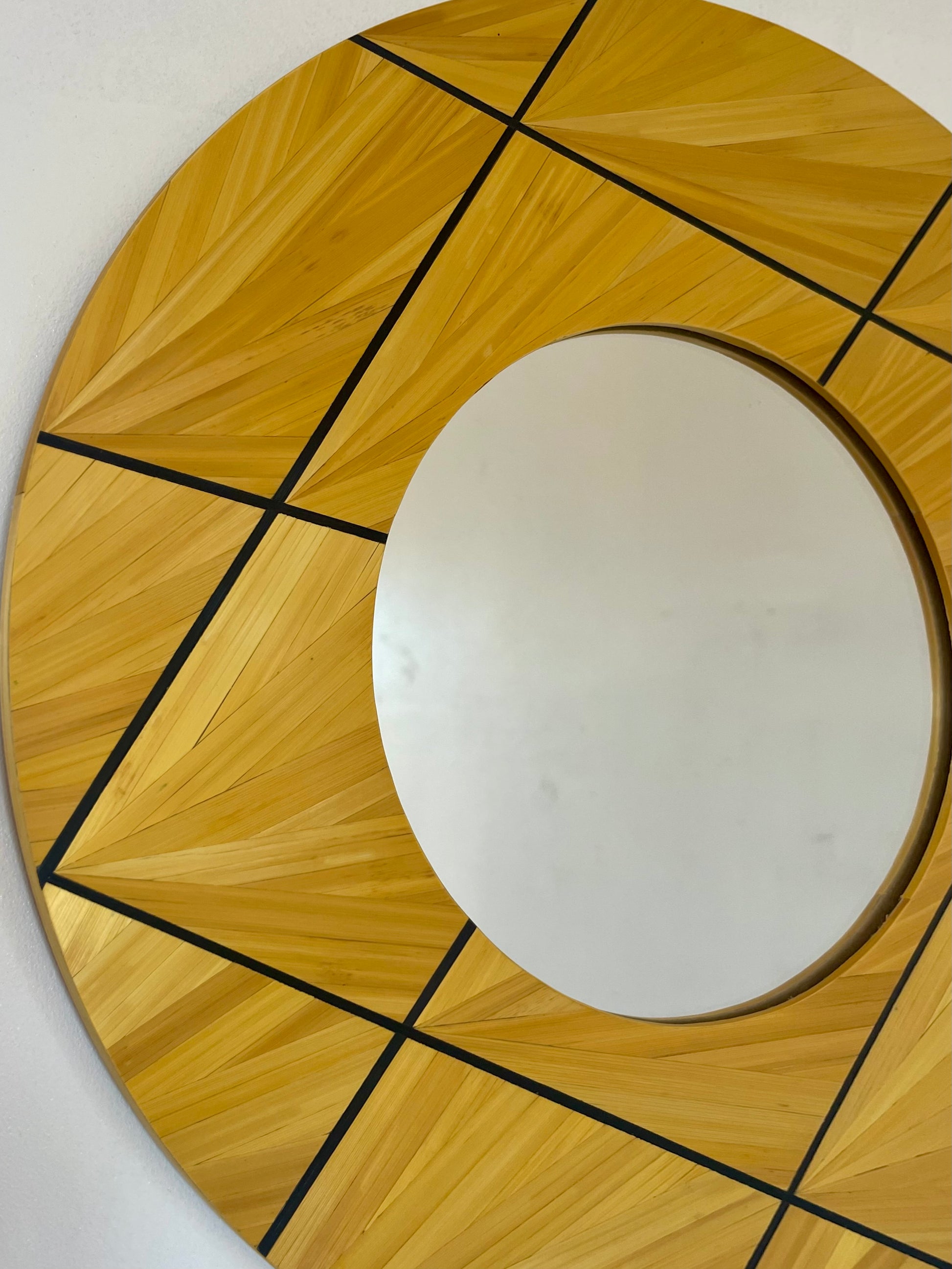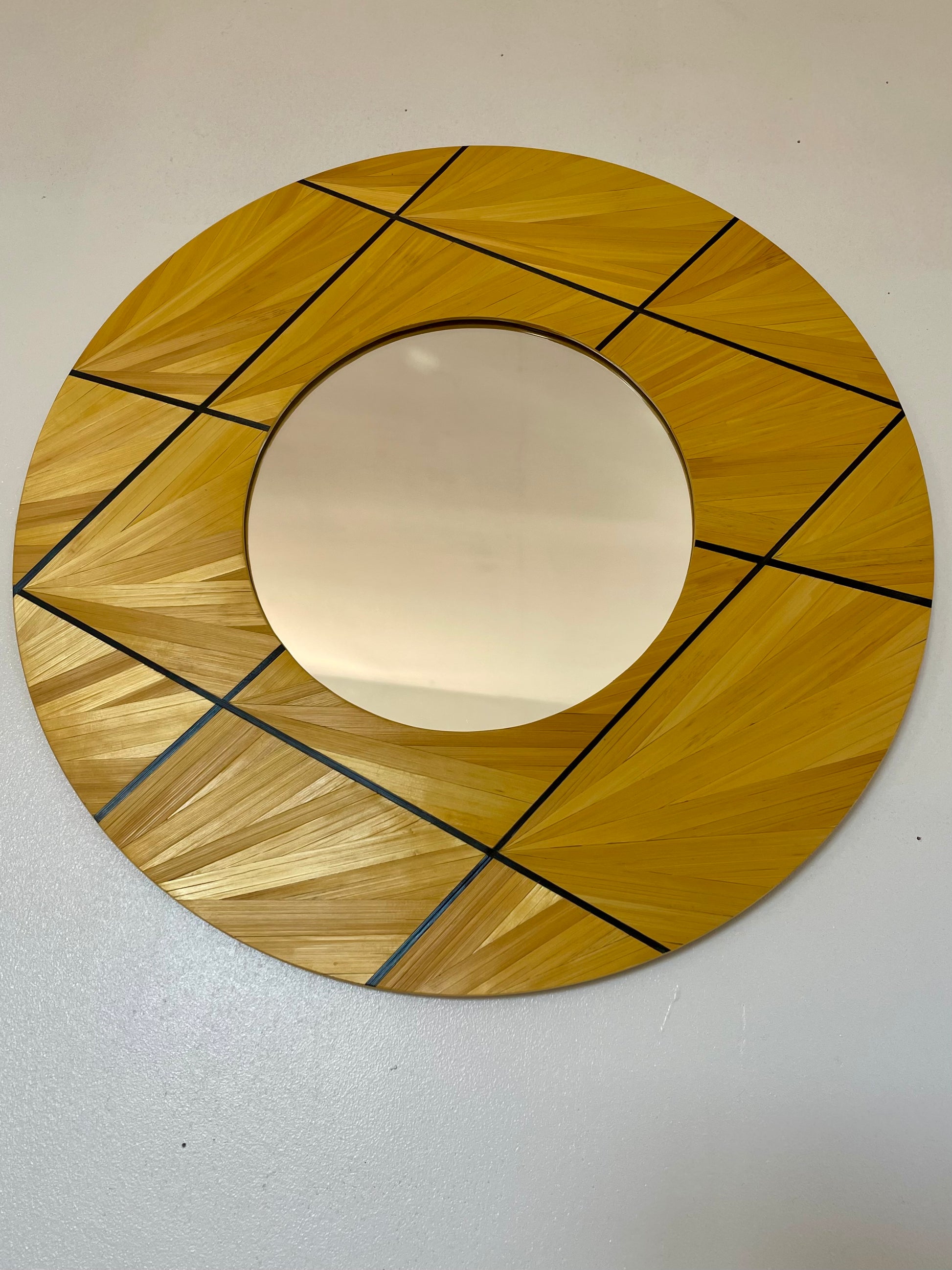 Découvrez l'élégance exclusive de mon Miroir « Rondeur de paille » en marqueterie de Paille. Chaque brin est sélectionné pour un rendu luxueux avec des reflets chatoyants. Ses tons doré et noir ajoutent du volume à votre intérieur. Réalisé à la main, c'est une véritable œuvre d'art qui apportera une touche unique à votre espace.