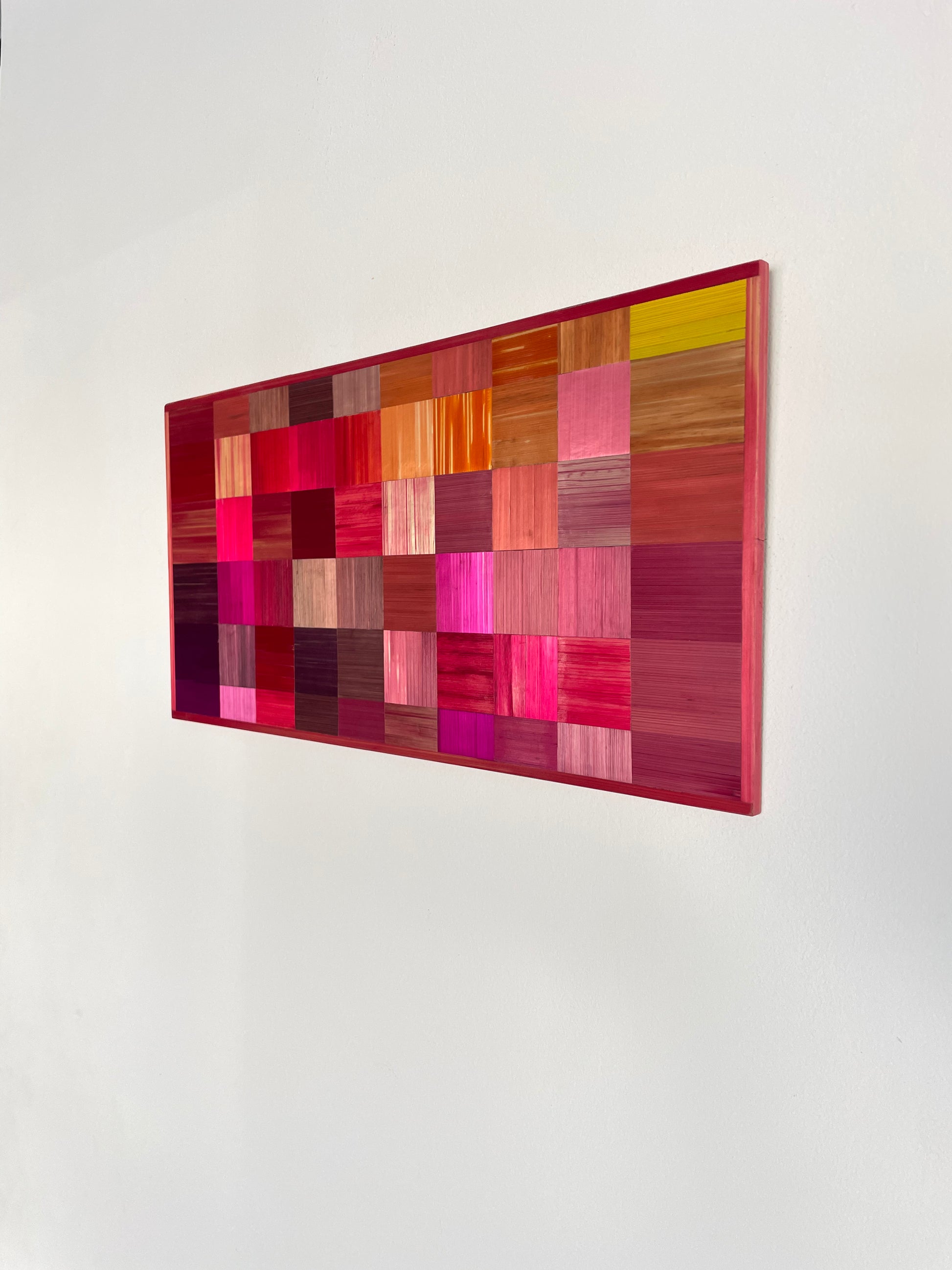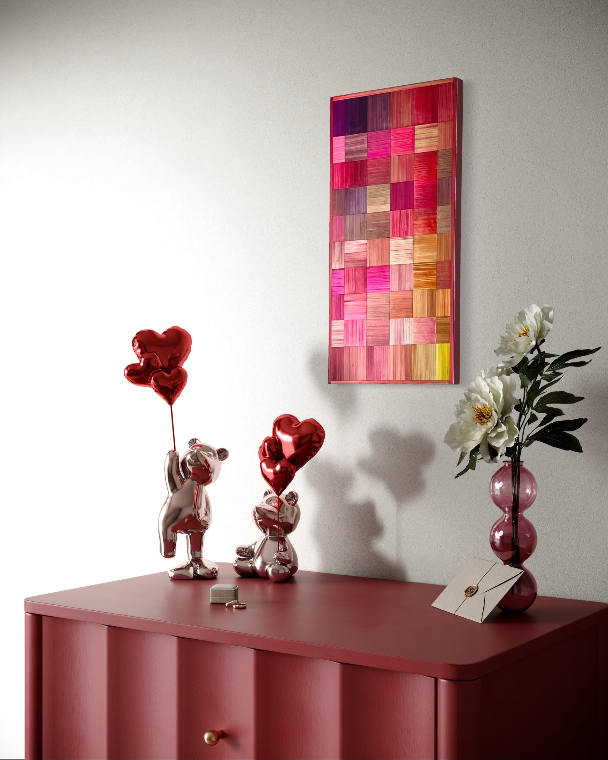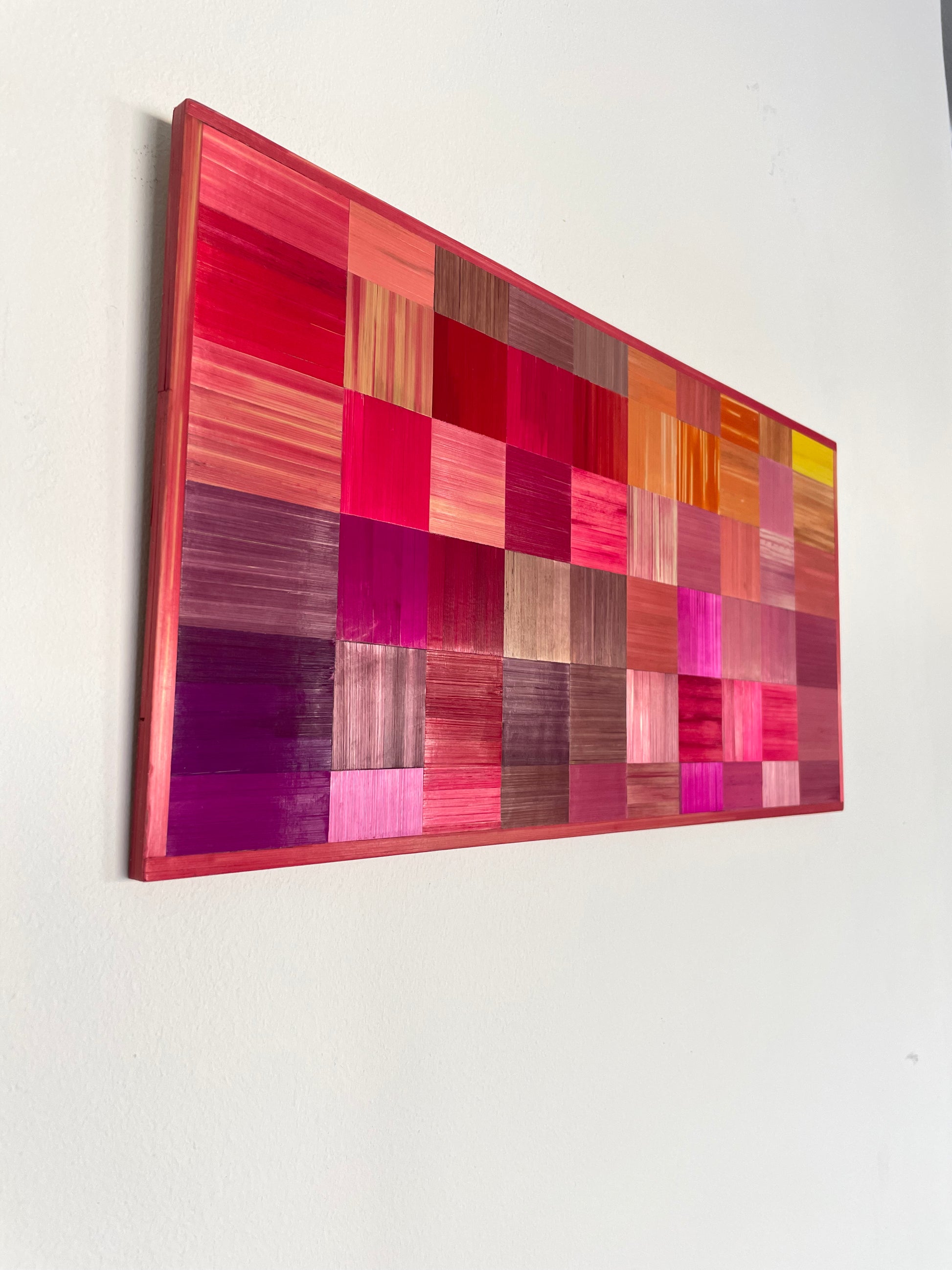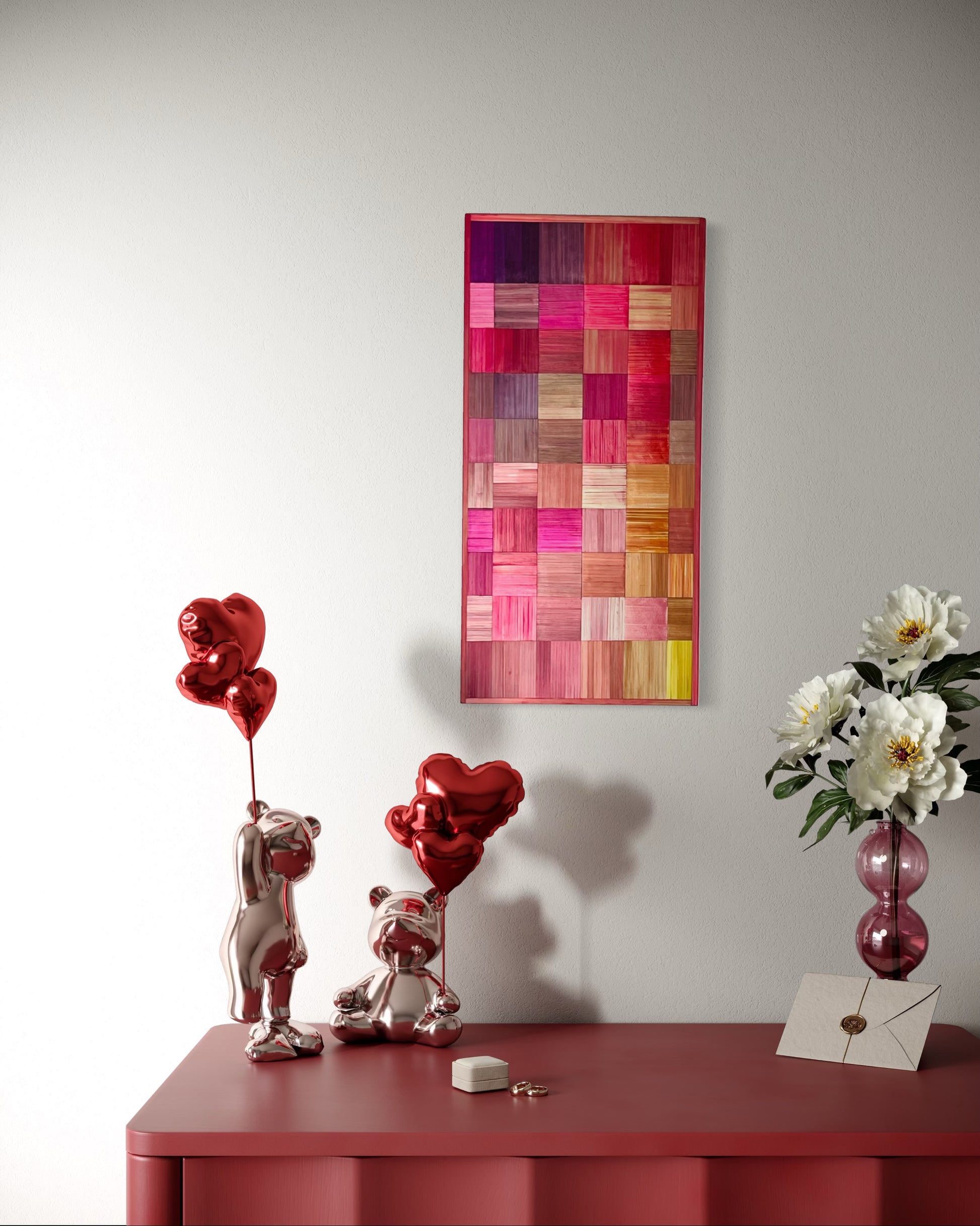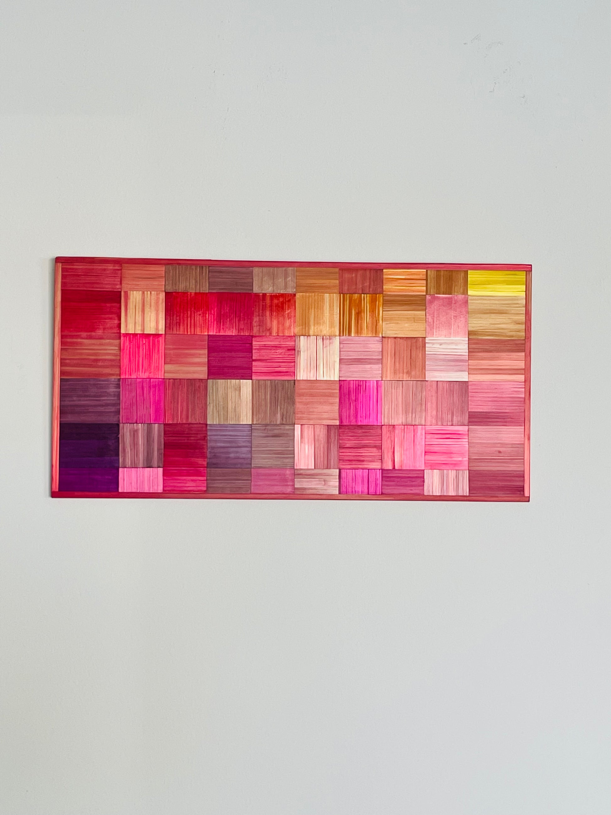 Touchez de lumière et de douceur à votre décor avec le Tableau Damier Rosé. Son design exclusif et audacieux, avec un dégradé de couleur rose en carreaux damier et une marqueterie de paille de seigle française, offre une touche sophistiquée et élégante à votre maison ou à votre bureau. Sa taille de 20/40 cm présentera un invité de choix à votre pièce.
