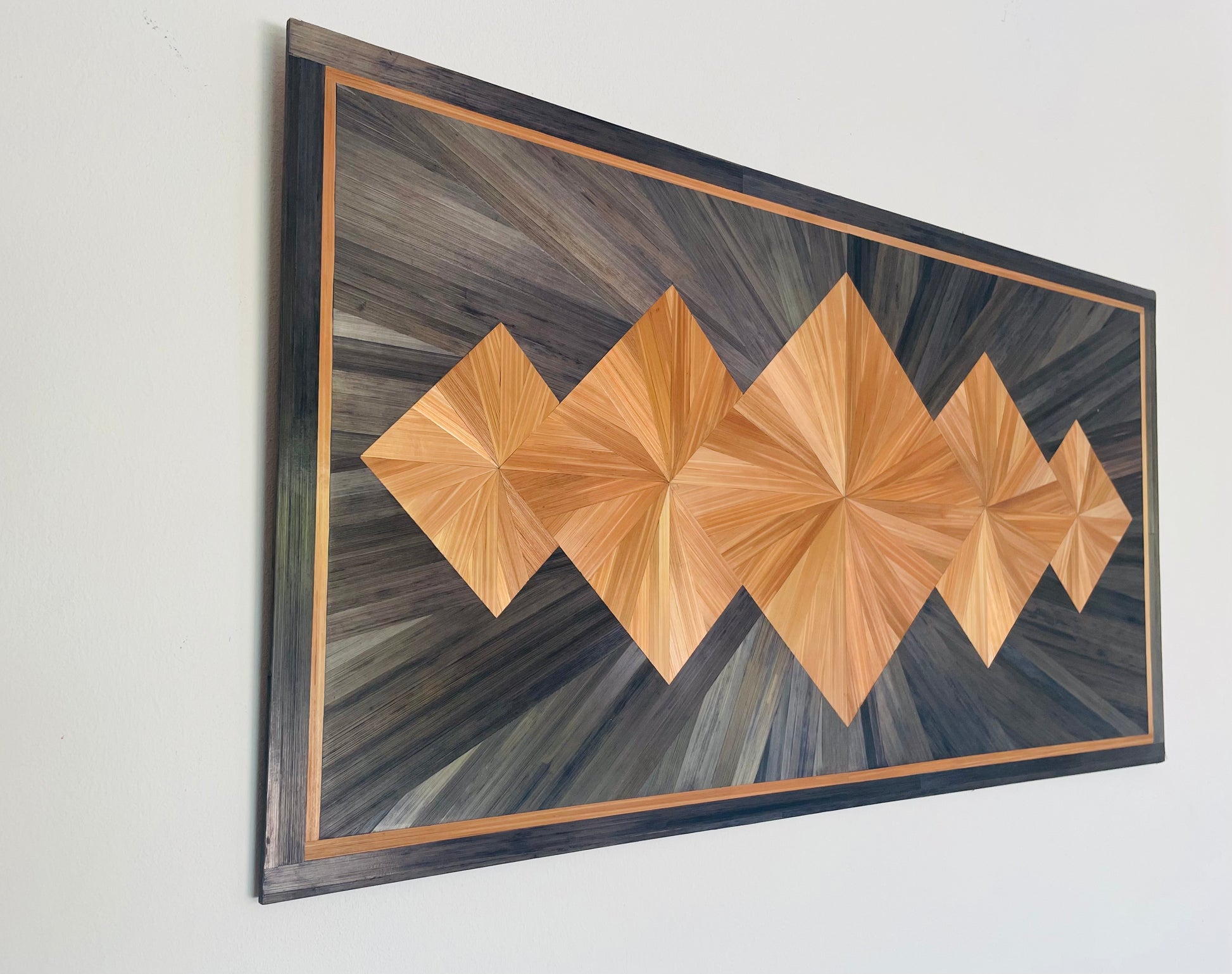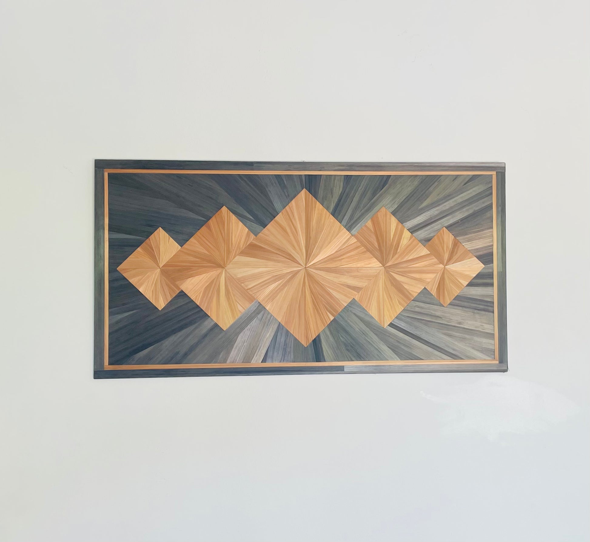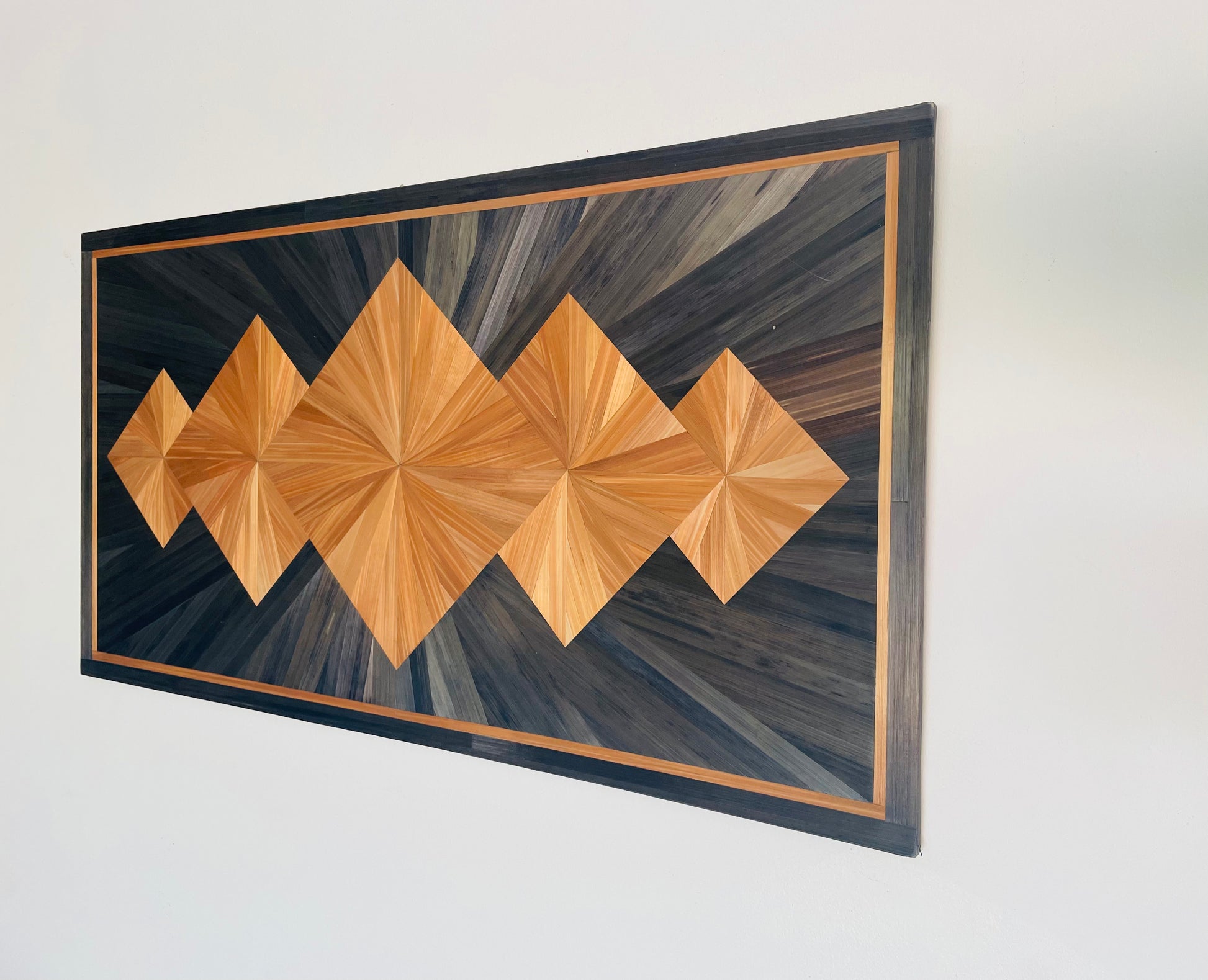 Captivant et raffiné, ce magnifique tableau géométrique en marqueterie de paille est une œuvre d'art baignée de lumière et d'élégance. Sublime grâce à sa profondeur et son relief, il nous offre un motif d'une grande complexité constitué de multiples soleils. Un tableau unique à l'aura luxueuse.